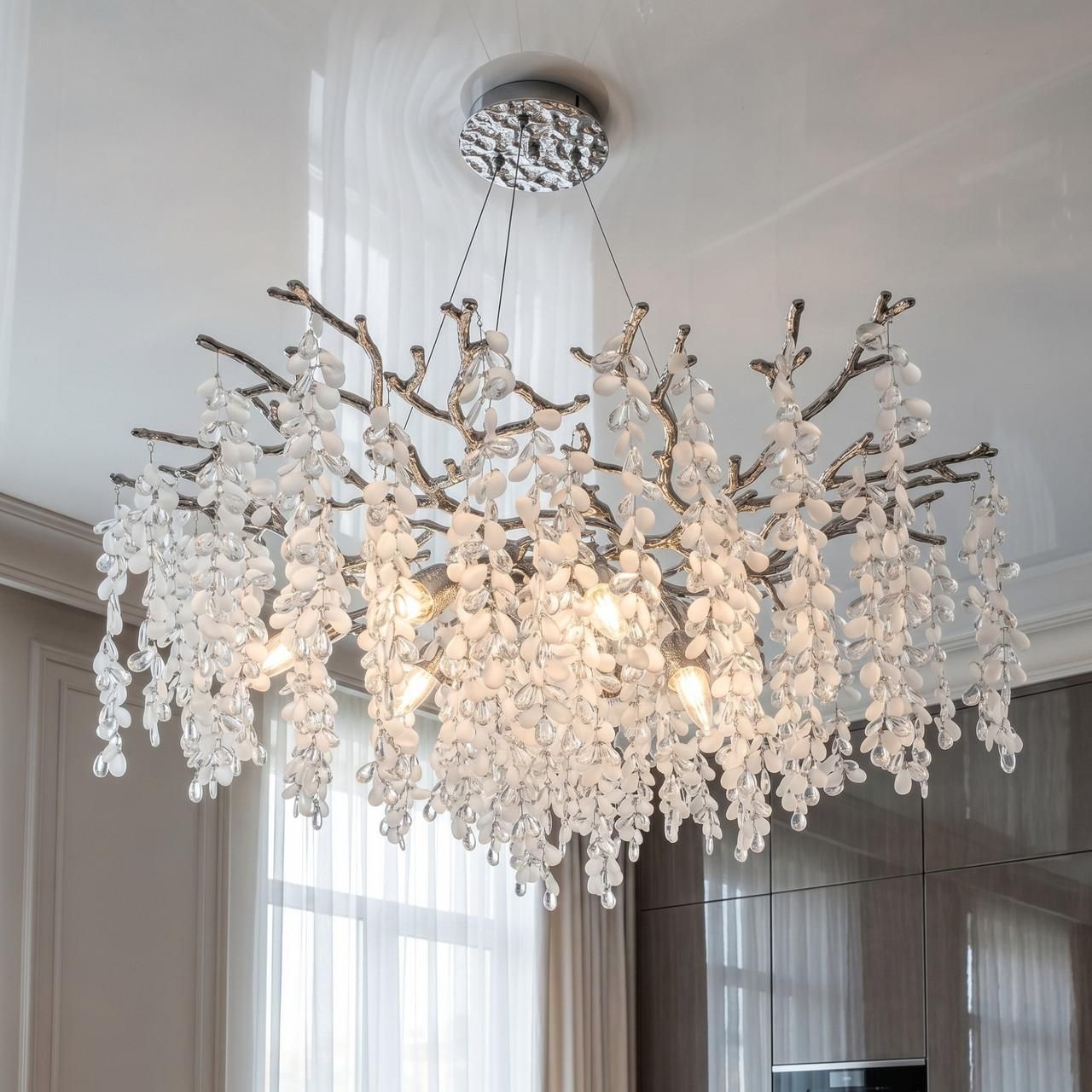 Современный осветительный прибор подвесного типа, выполненный в стиле флористика. Модель представляет собой металлическую конструкцию в цвете зеркальный хром, декорированную каскадом прозрачных хрустальных подвесок. Благодаря значительному диаметру (76 см) и десяти источникам света, люстра обеспечивает интенсивное и равномерное освещение просторных помещений, выполняя роль центрального элемента интерьера.