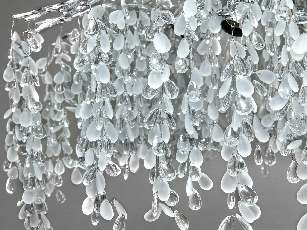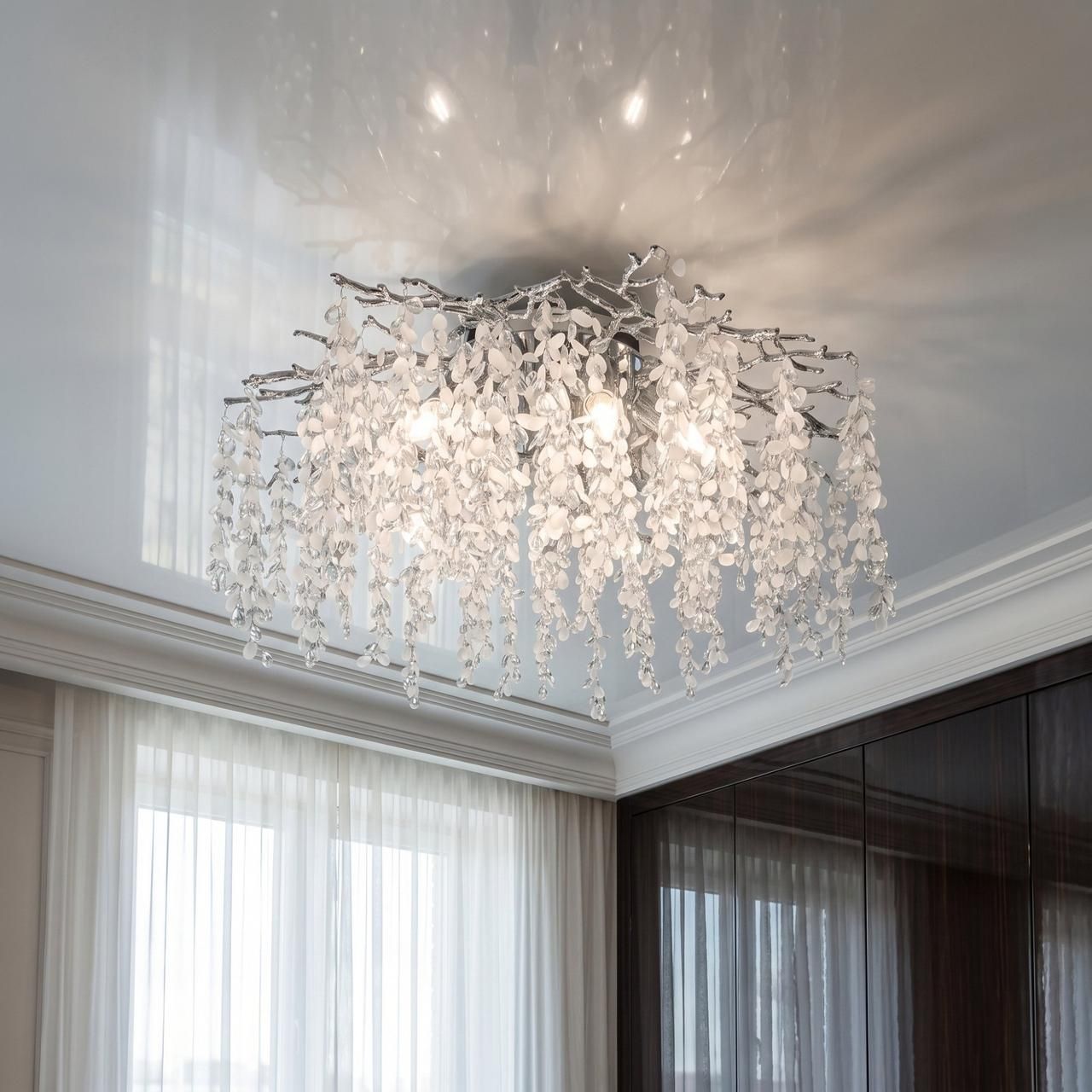 При использовании ламп с нейтральной цветовой температурой люстра создает чистую, светлую атмосферу. Расположение хрустальных нитей обеспечивает мягкую игру бликов на поверхностях, что характерно для интерьеров в стиле неоклассика, модерн или хай-тек. Зеркальное покрытие корпуса визуально расширяет пространство потолка.
