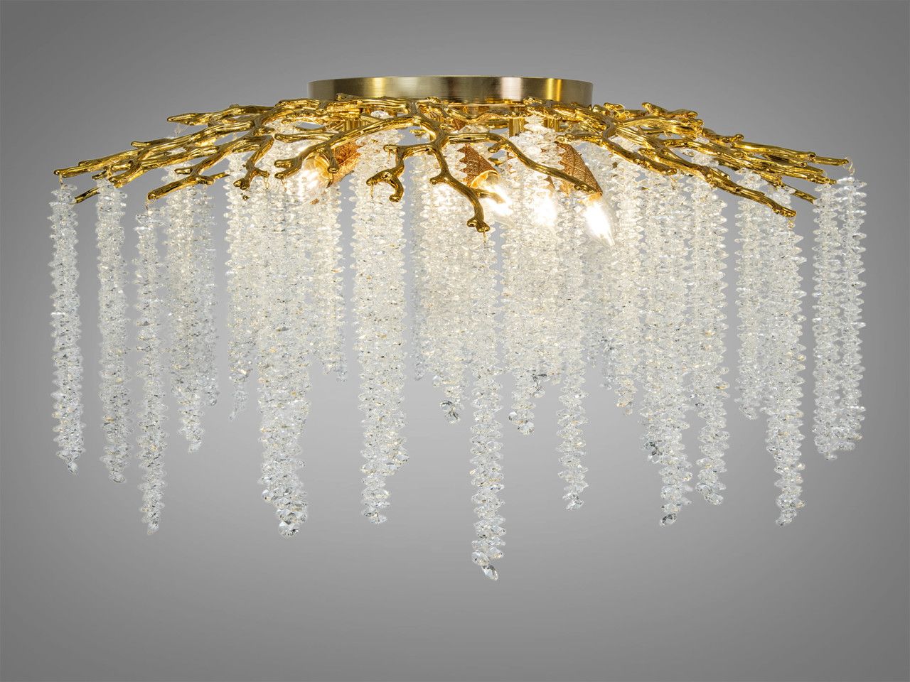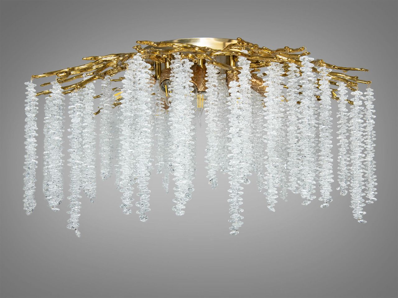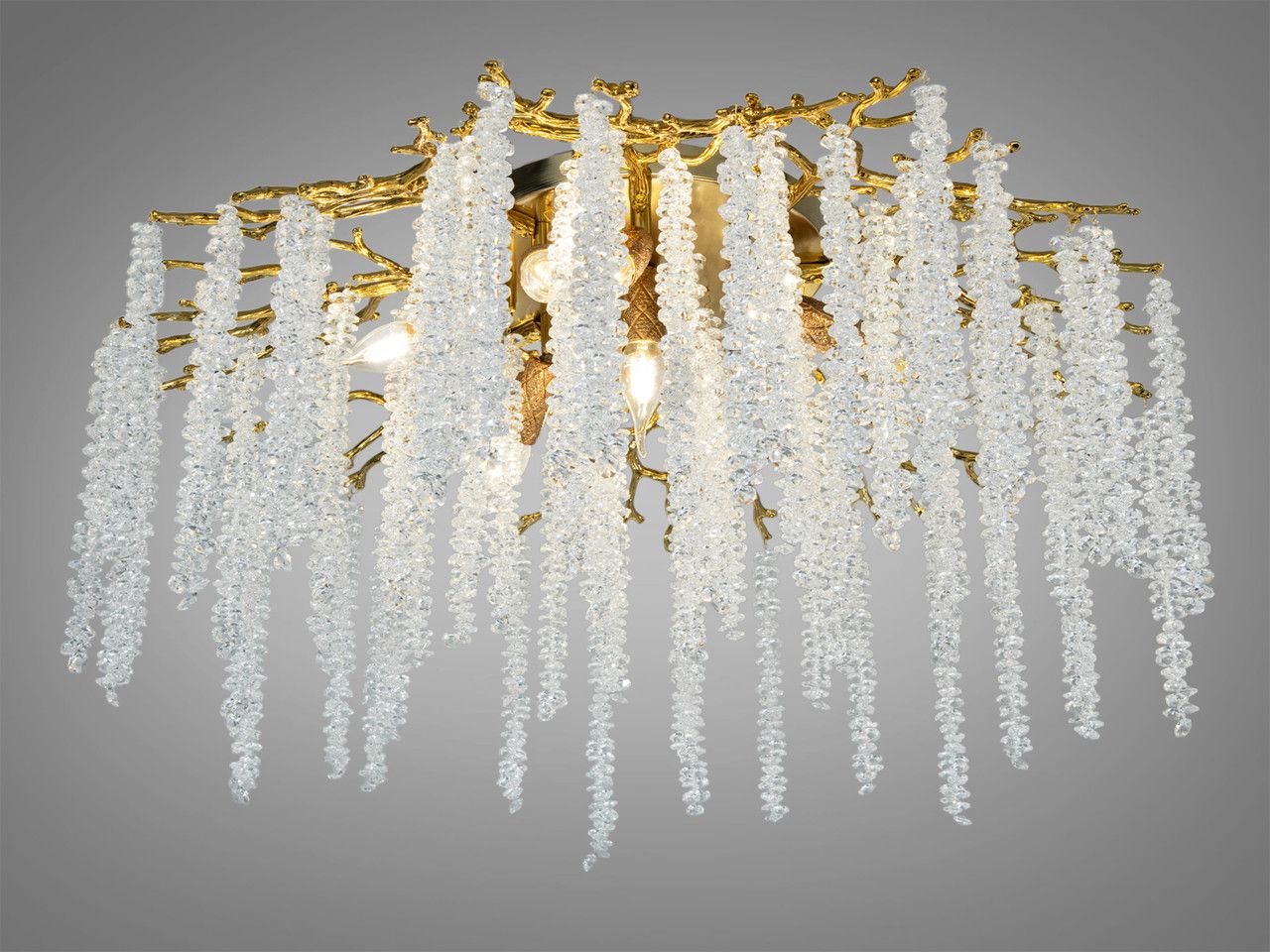 Современная потолочная люстра в стиле флористика, выполненная в благородном цвете античной бронзы. Конструкция представляет собой металлическое основание в форме переплетенных ветвей, декорированных каскадом из нитей прозрачного хрусталя. Благодаря девяти источникам света и значительному диаметру (80 см), люстра обеспечивает интенсивное основное освещение в просторных помещениях со стандартной высотой потолков.