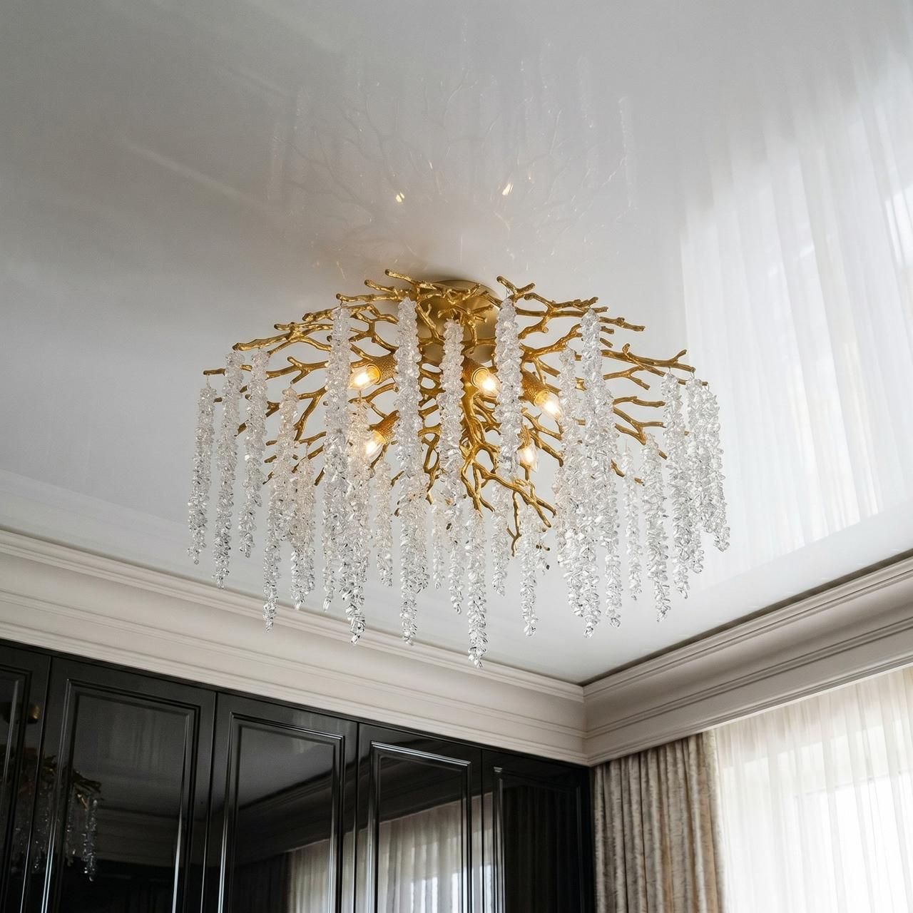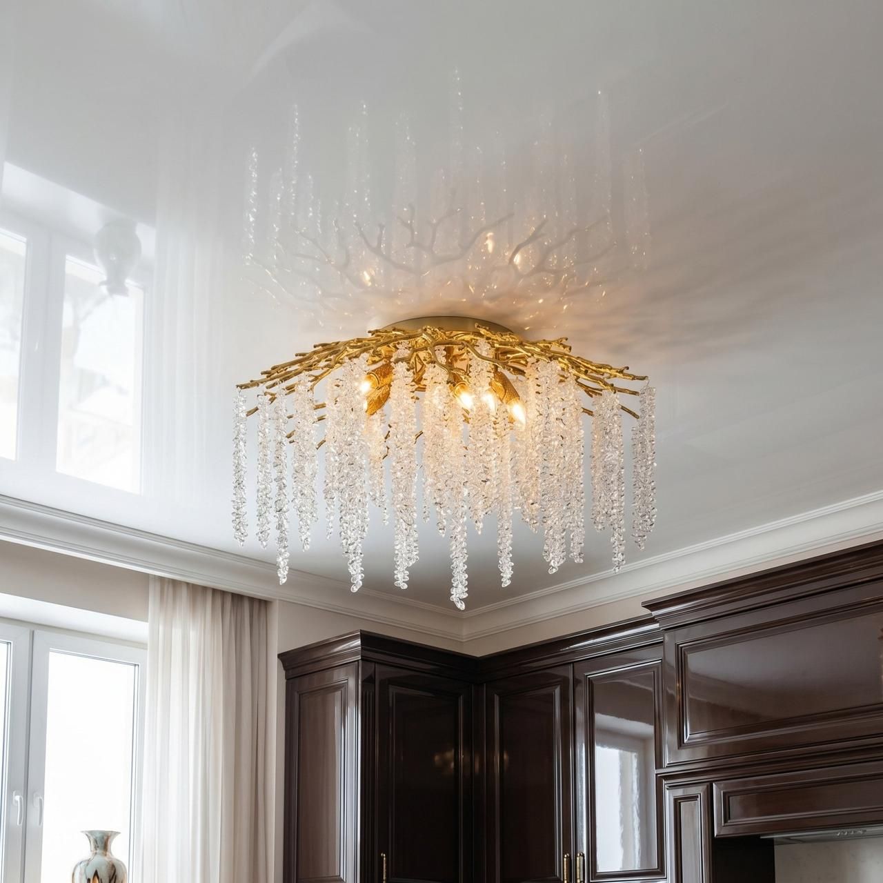 При использовании ламп с теплой цветовой температурой люстра создает уютную атмосферу. Расположение хрустальных нитей обеспечивает мягкую игру бликов на поверхностях, что характерно для интерьеров в стиле неоклассика, модерн или арт-деко. Бронзовый оттенок основания гармонирует с мебелью из натурального дерева и текстилем в пастельных тонах.