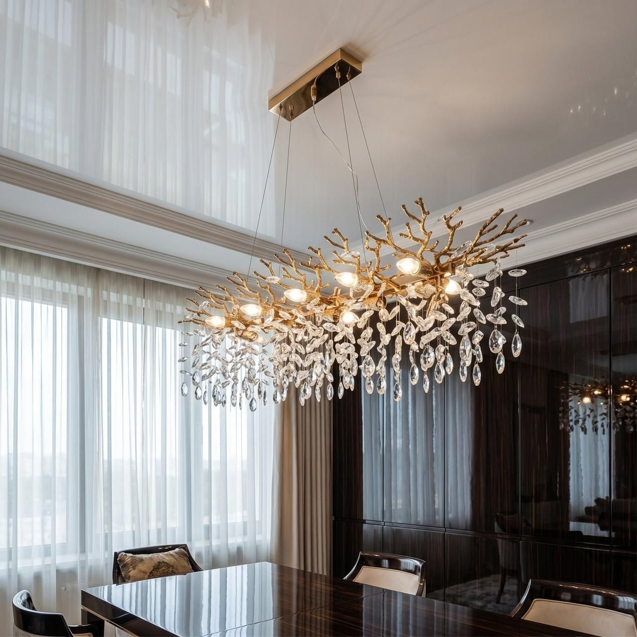Модель идеально подходит для прямоугольных столов на 8-12 персон. Хрустальные элементы работают как естественные рассеиватели: они преломляют лучи, убирая слепящий эффект и наполняя зону приема пищи мягким, торжественным сиянием. Регулируемая высота подвеса позволяет настроить уровень света под конкретные габариты мебели.