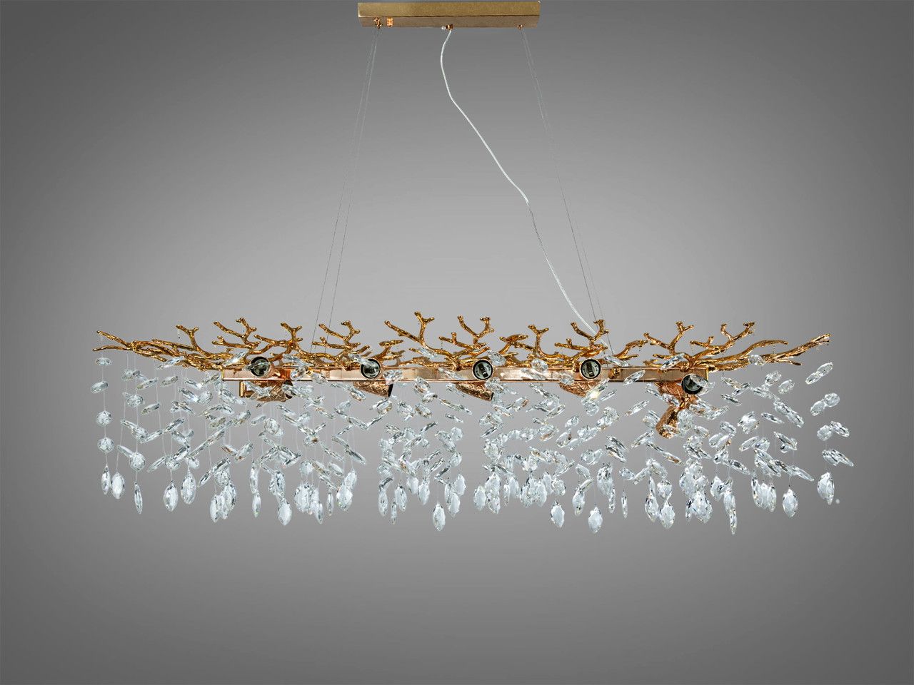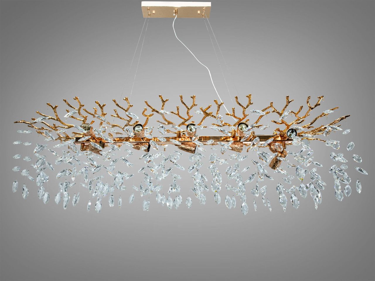 Современная подвесная люстра линейной формы, выполненная в стиле флористики и органического модерна. Модель представляет собой металлический каркас с зеркальным золотым покрытием, декорированный каскадом из прозрачных хрустальных подвесок. Благодаря внушительной длине 122 см и двенадцати источникам света, люстра обеспечивает мощный и равномерный световой поток, идеально подходящий для акцентного освещения вытянутых функциональных зон.