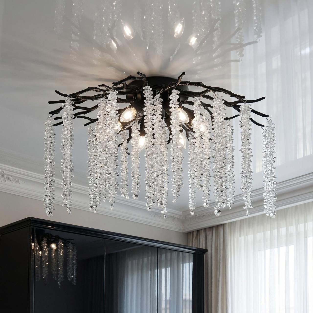 Современная потолочная люстра в стиле флористика, выполненная в редком цветовом решении «черный глянец» (гальваническое покрытие). Модель представляет собой металлическое основание в форме переплетенных ветвей, декорированных каскадом прозрачных хрустальных подвесок. Благодаря семи источникам света и компактной высоте (34 см), люстра обеспечивает интенсивное основное освещение в помещениях со стандартными и низкими потолками, подчеркивая графичность современного интерьера.