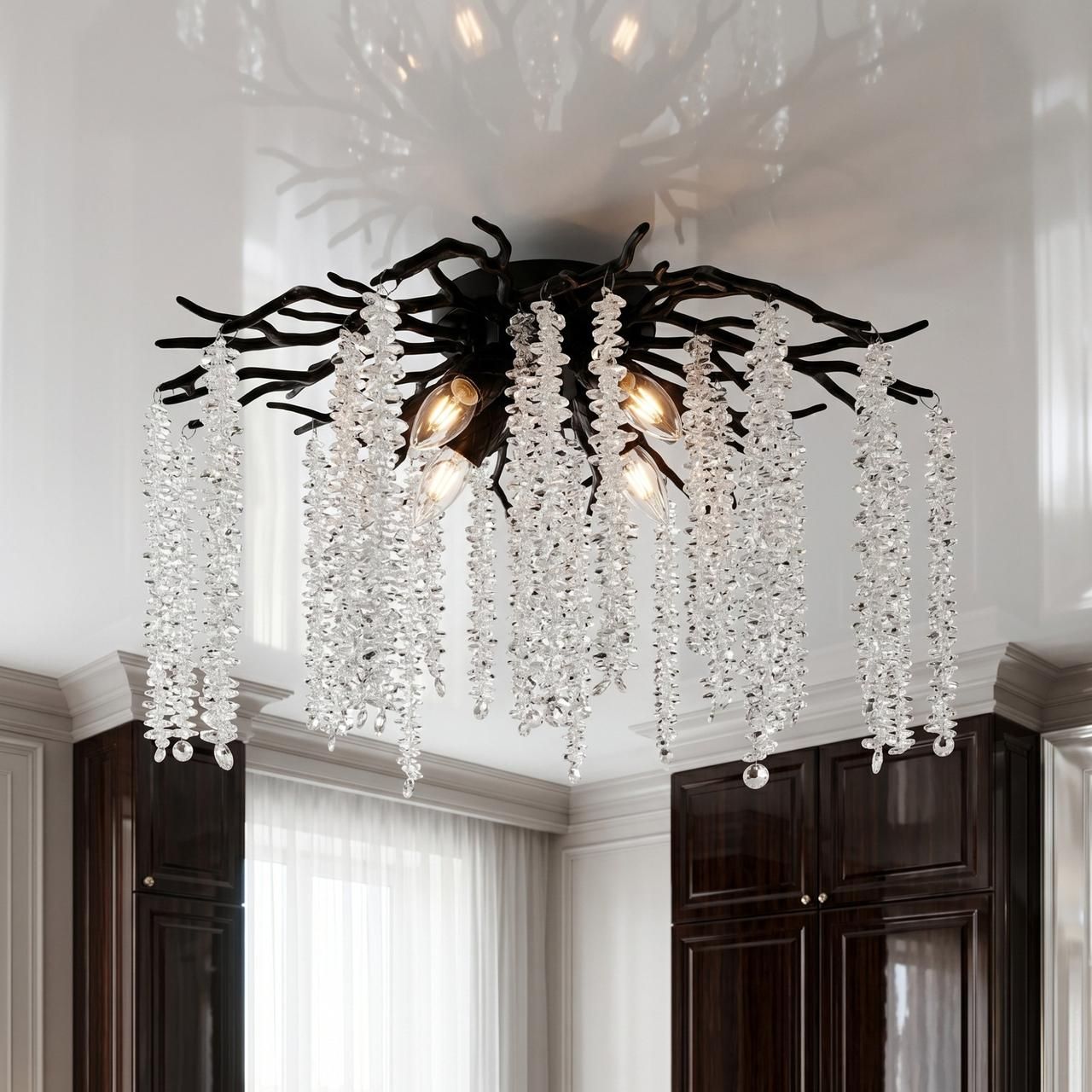 Дизайн модели в виде ветвей с кристаллами гармонирует с современными отделочными материалами: бетоном, стеклом и декоративной штукатуркой. Компактная высота 34 см позволяет сохранить полезный объем помещения, что критично для современных квартир. При использовании ламп с нейтральной цветовой температурой люстра создает чистую, технологичную атмосферу.