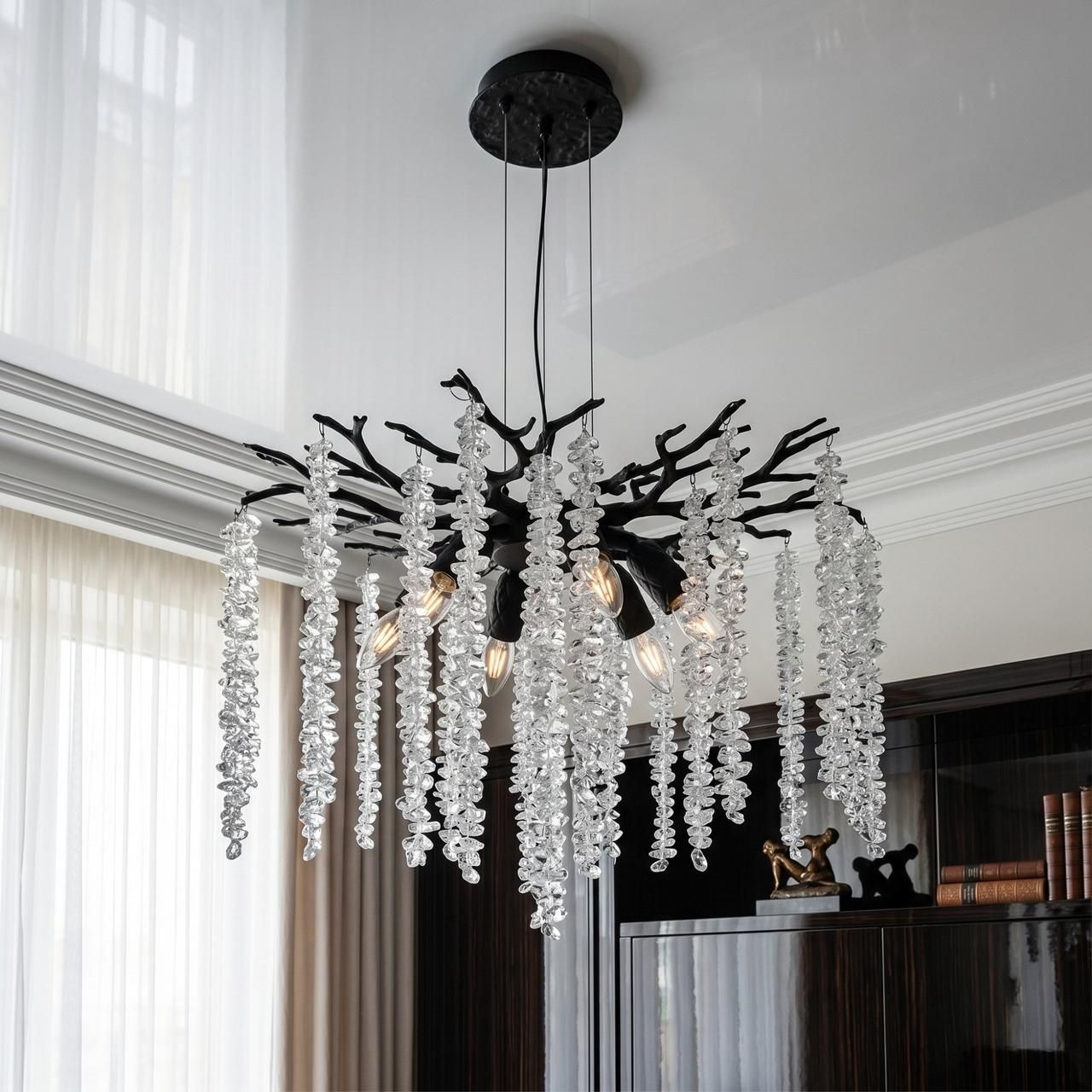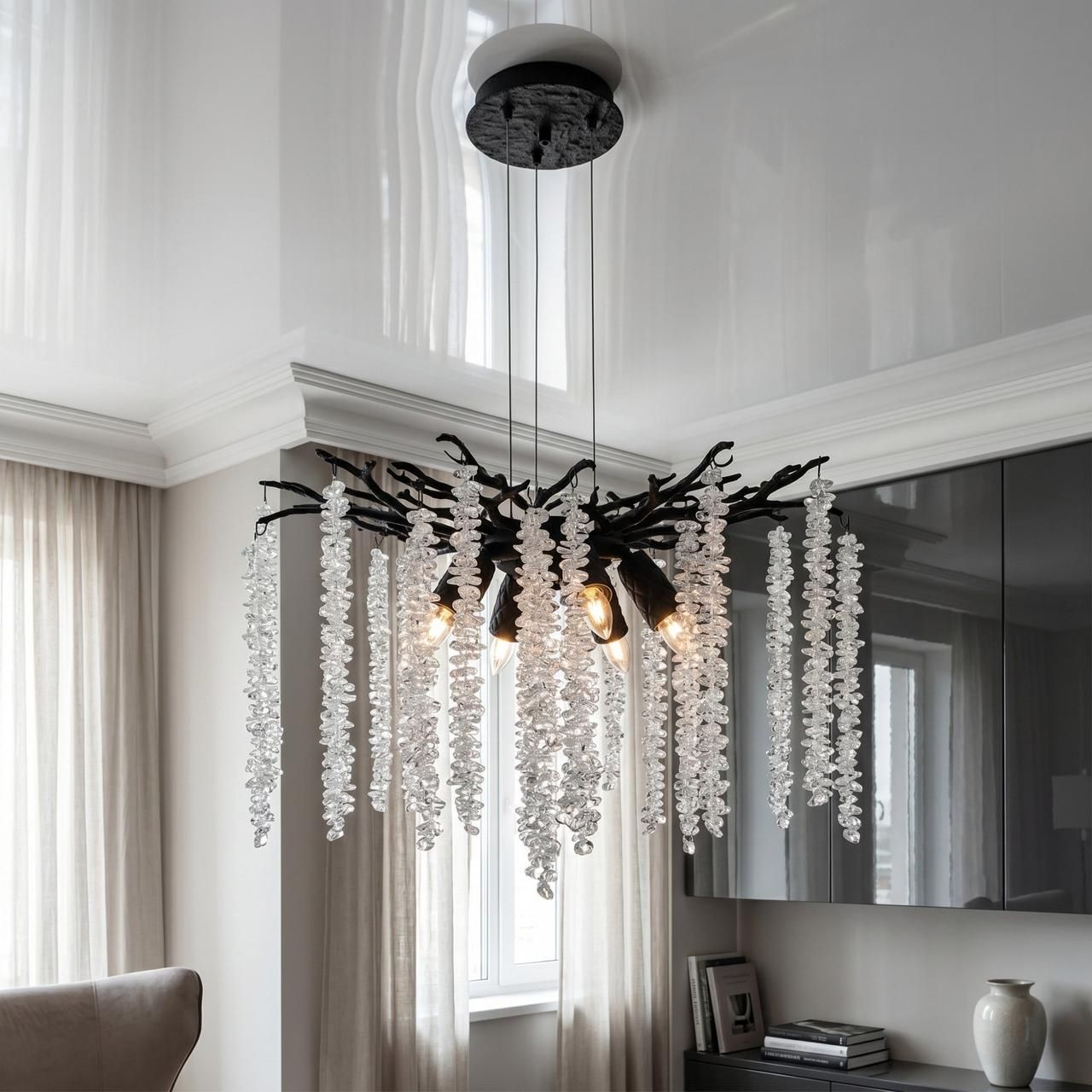 В жилых интерьерах черная люстра создает выразительный контраст на фоне светлых поверхностей. При использовании ламп с теплой цветовой температурой хрустальные подвески наполняют комнату мягкими бликами, создавая уютную атмосферу для отдыха.