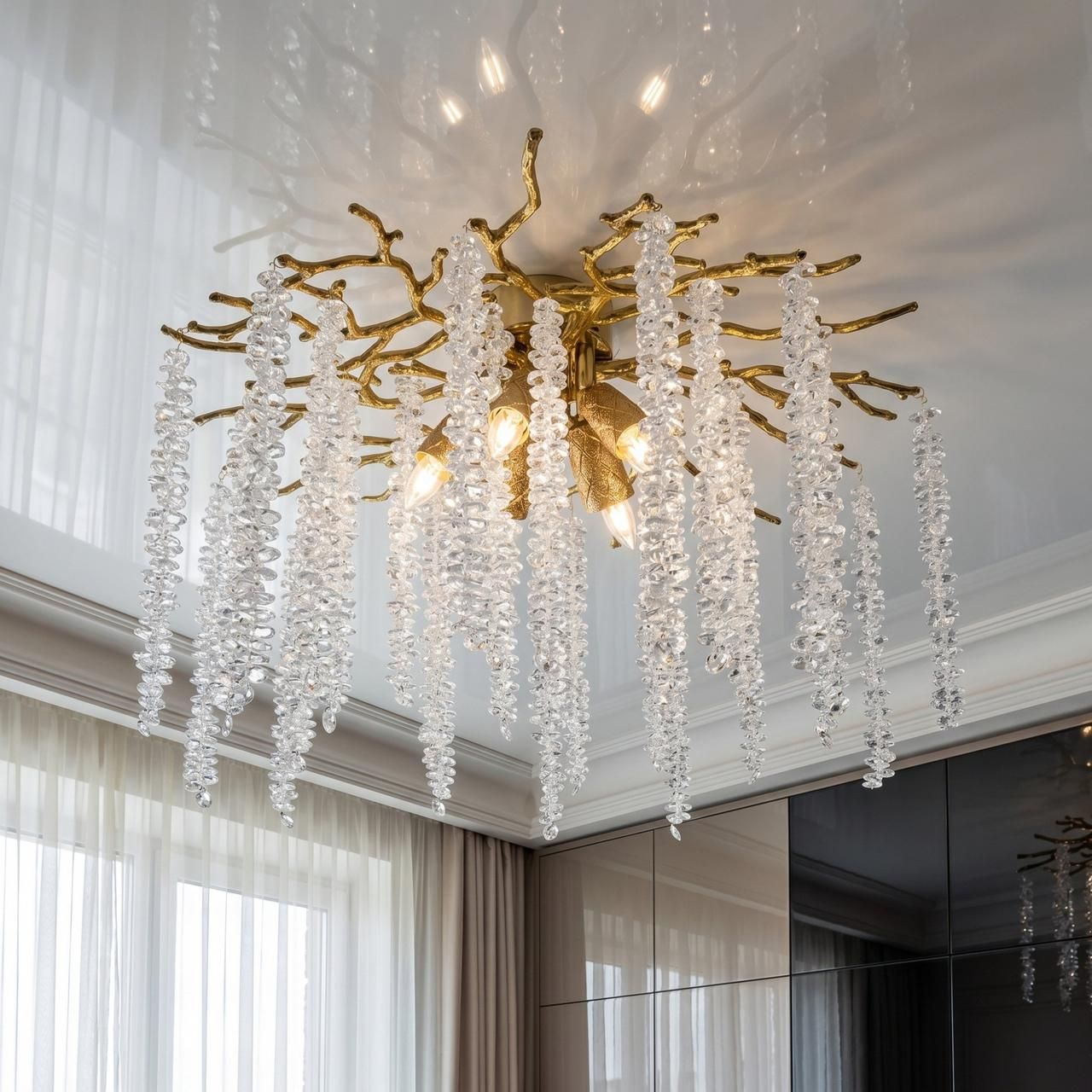 Дизайн модели в виде ветвей с каплями росы превращает люстру в самостоятельный элемент декора. Светильник гармонично сочетается с интерьерами в стиле неоклассика, лофт или модерн. Бронзовое покрытие корпуса отражает свет, визуально облегчая конструкцию и добавляя помещению глубины.