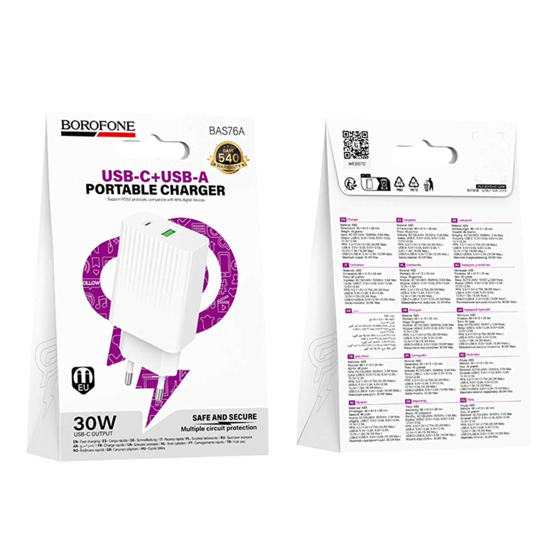 Сетевое зарядное устройство Borofone BAS76A — это современный и мощный адаптер питания, разработанный для быстрой и безопасной зарядки широкого спектра портативных устройств. Модель сочетает высокую выходную мощность, поддержку передовых протоколов зарядки и удобную конструкцию с двумя разъёмами для одновременного использования.
