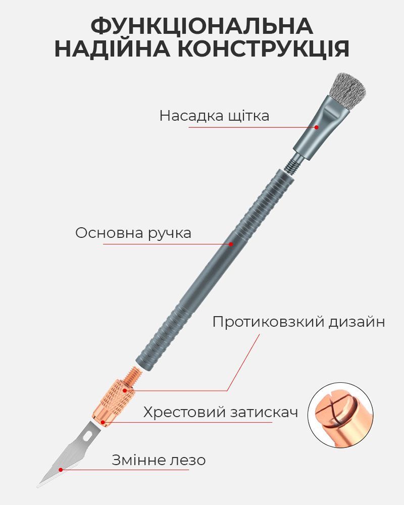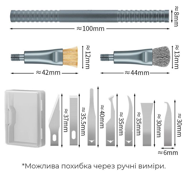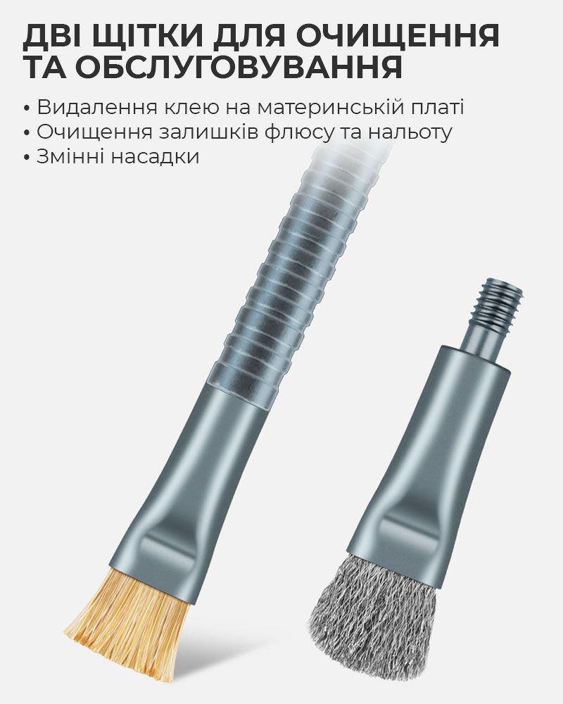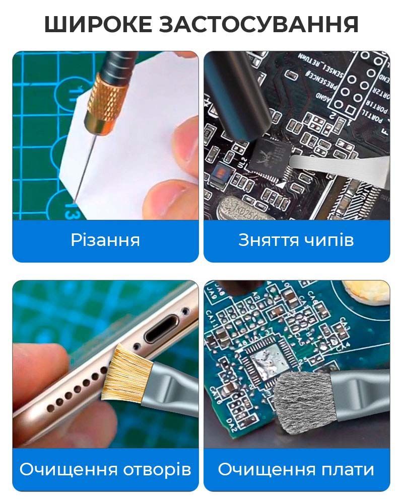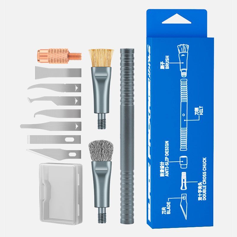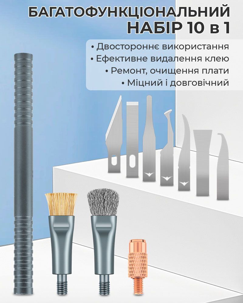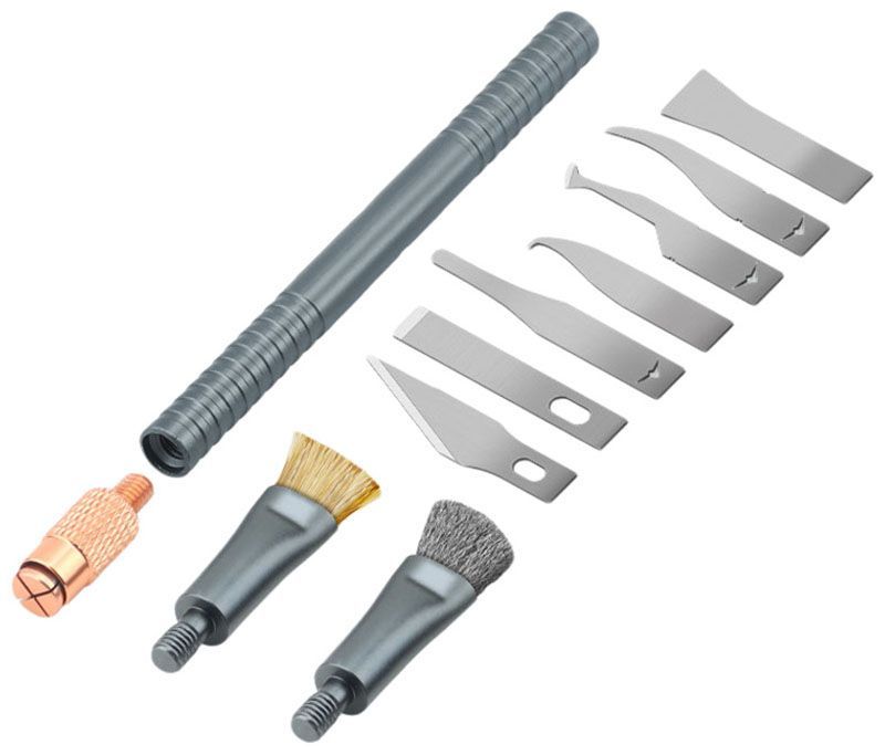 - Этот набор объединяет функции скальпеля, скребка и щёток, позволяя выполнять широкий спектр задач при ремонте электроники.