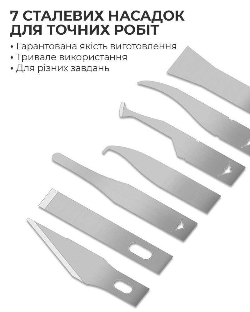 - Семь стальных лезвий различной формы обеспечивают точную работу в труднодоступных зонах и позволяют подобрать оптимальный инструмент под конкретную задачу.