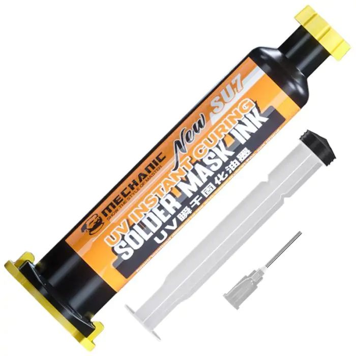 Ультрафиолетовый лак Mechanic SU7 — это профессиональный материал для ремонта и восстановления электронных плат, предназначенный для изоляции, защиты и фиксации элементов. Быстросохнущая УФ-маска обеспечивает надежное покрытие поврежденных участков, эффективно восстанавливая защитный слой платы после пайки или ремонта. Благодаря современной формуле, состав затвердевает всего за несколько секунд под воздействием ультрафиолетового излучения, что значительно ускоряет рабочий процесс.