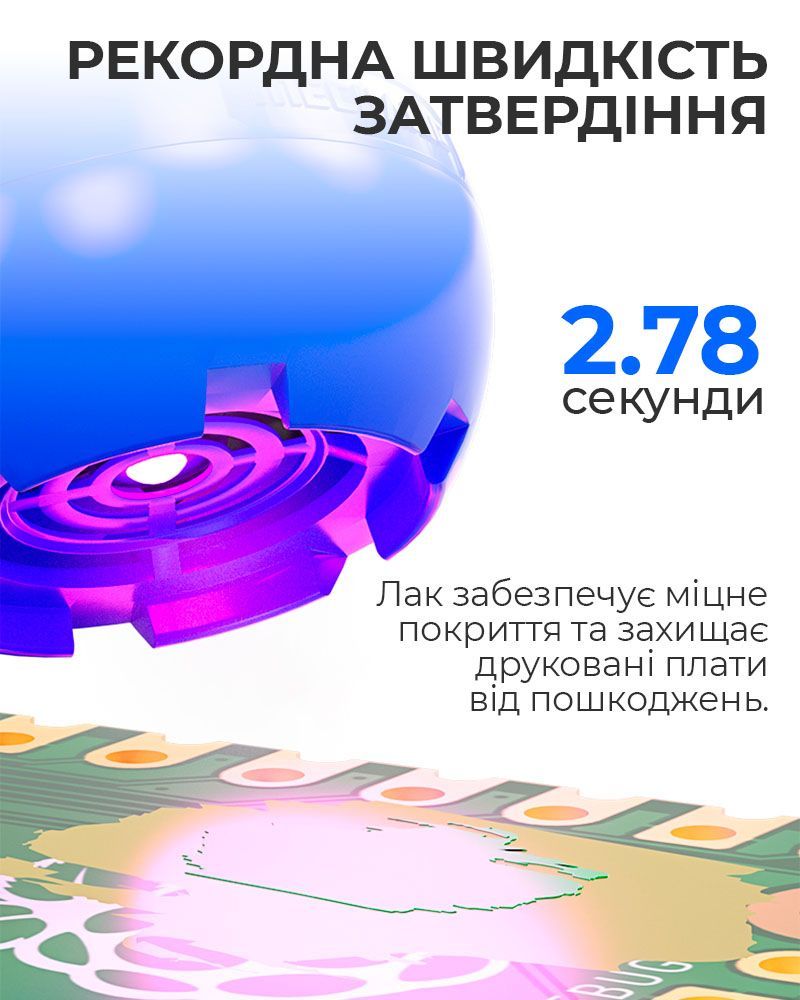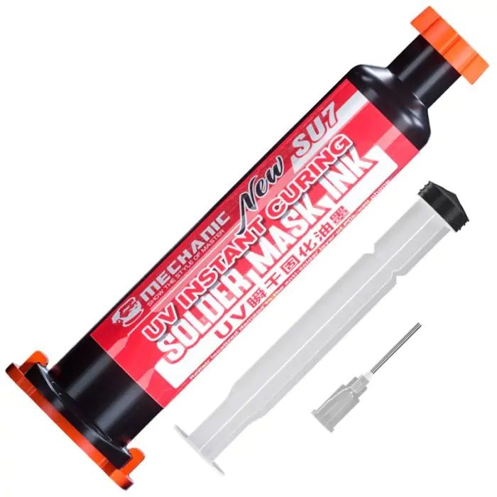 Ультрафиолетовый лак Mechanic SU7 — это профессиональный материал для ремонта и восстановления электронных плат, предназначенный для изоляции, защиты и фиксации элементов. Быстросохнущая УФ-маска обеспечивает надежное покрытие поврежденных участков, эффективно восстанавливая защитный слой платы после пайки или ремонта. Благодаря современной формуле, состав затвердевает всего за несколько секунд под воздействием ультрафиолетового излучения, что значительно ускоряет рабочий процесс.