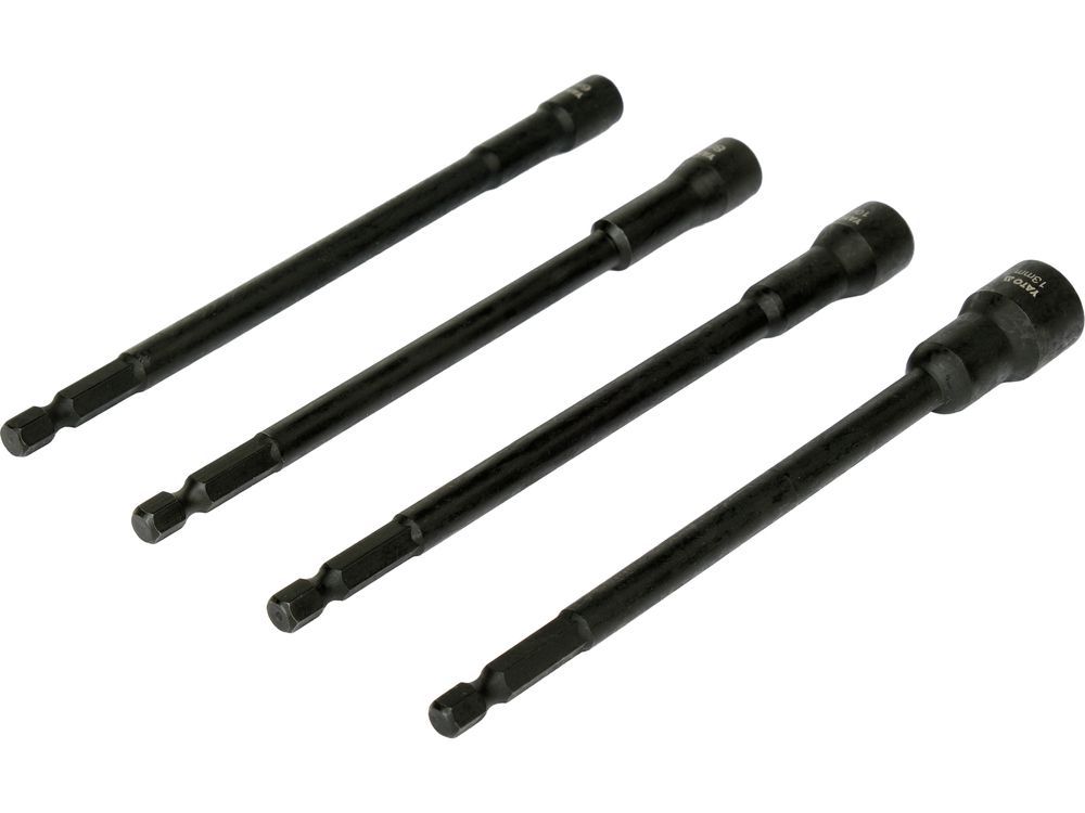 Набор длинных магнитных головок, предназначенных для использования с отвертками и дрелью, оснащенными шестигранным патроном 1/4 дюйма (6,3 мм).
