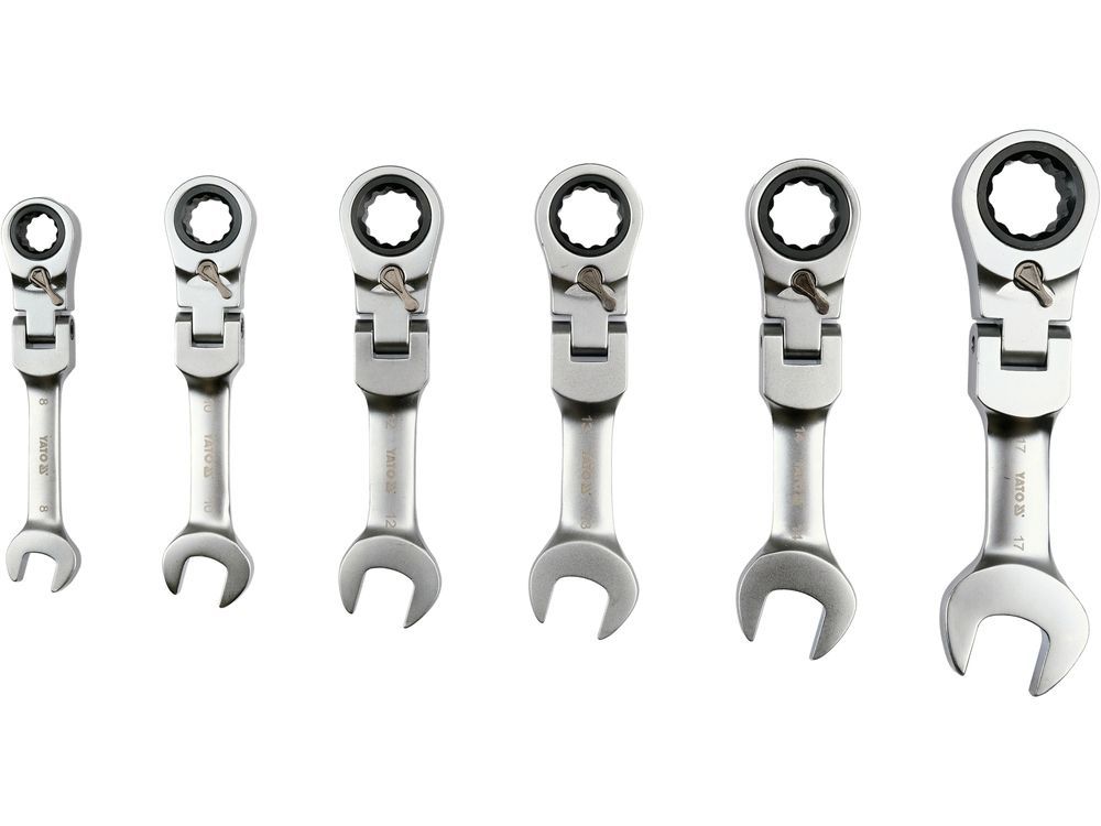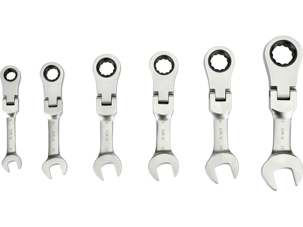 Набор коротких комбинированных ключей с трещоткой и поворотной головкой предназначен для обслуживания винтовых соединений в местах с ограниченным рабочим пространством.
