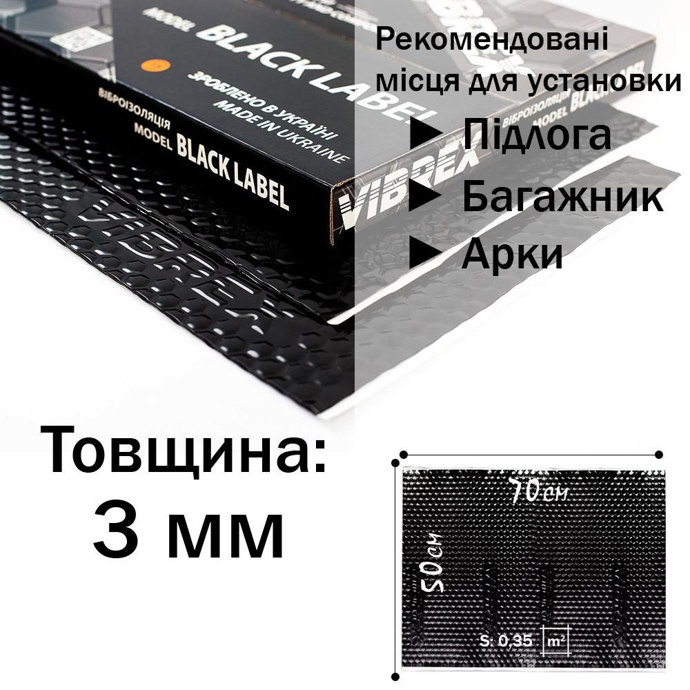 Black Label 3 мм Виброизоляция бизнес класса от тм Vibrex. Благодаря уникальной формуле бутилкаучуковой мастики Extreme - S удалось достичь увеличенного на 20% коэффициента механических потерь (КМП), на 34% повысилась адгезия к металлу и пластику, увеличился диапазон рабочих температур. Материал, как и предшественник Vibrex Master, состоит из полимерного слоя без добавления битума, гудрона и продуктов вторичной переработки. То есть при монтаже нет необходимости в нагреве и виброизоляция не выделяет вредных веществ, а эффективность сопоставима с самыми дорогими материалами премиум класса. Применение данной виброизоляции в комплексе с шумоизоляционными материалами позволяет снизить уровень шума и вибраций в авто более чем в 2,5 раза. Гарантия на виброизоляцию 15 лет! Vibrex Black Label - эффективный вибропоглотитель с улучшенными характеристиками и абсолютно новыми свойствами. - толщина 3,0 мм; - размер листа 500*700 мм; - толщина фольги 100 микрон; - КМП 0,51; - дополнительные антикоррозионные свойства; - вес