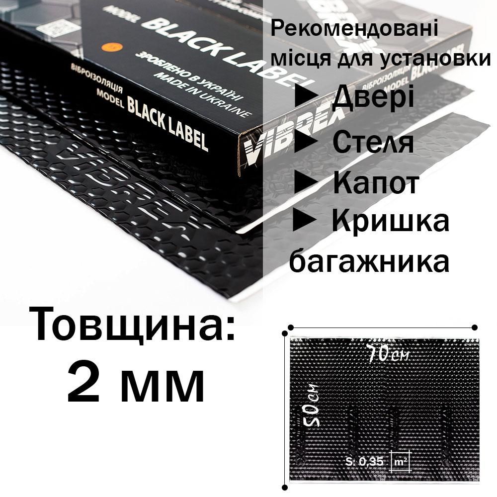 Black Label 2 мм Виброизоляция бизнес класса от тм Vibrex. Благодаря уникальной формуле бутилкаучуковой мастики Extreme - S удалось достичь увеличенного на 20% коэффициента механических потерь (КМП), на 34% повысилась адгезия к металлу и пластику, увеличился диапазон рабочих температур. Материал, как и предшественник Vibrex Master, состоит из полимерного слоя без добавления битума, гудрона и продуктов вторичной переработки. То есть при монтаже нет необходимости в нагреве и виброизоляция не выделяет вредных веществ, а эффективность сопоставима с самыми дорогими материалами премиум класса. Применение данной виброизоляции в комплексе с шумоизоляционными материалами позволяет снизить уровень шума и вибраций в авто более чем в 2,5 раза. Гарантия на виброизоляцию 15 лет! Vibrex Black Label - эффективный вибропоглотитель с улучшенными характеристиками и абсолютно новыми свойствами. - толщина 2,0 мм; - размер листа 500*700 мм; - толщина фольги 100 микрон; - КМП 0,35; - дополнительные антикоррозионные свойства; - вес