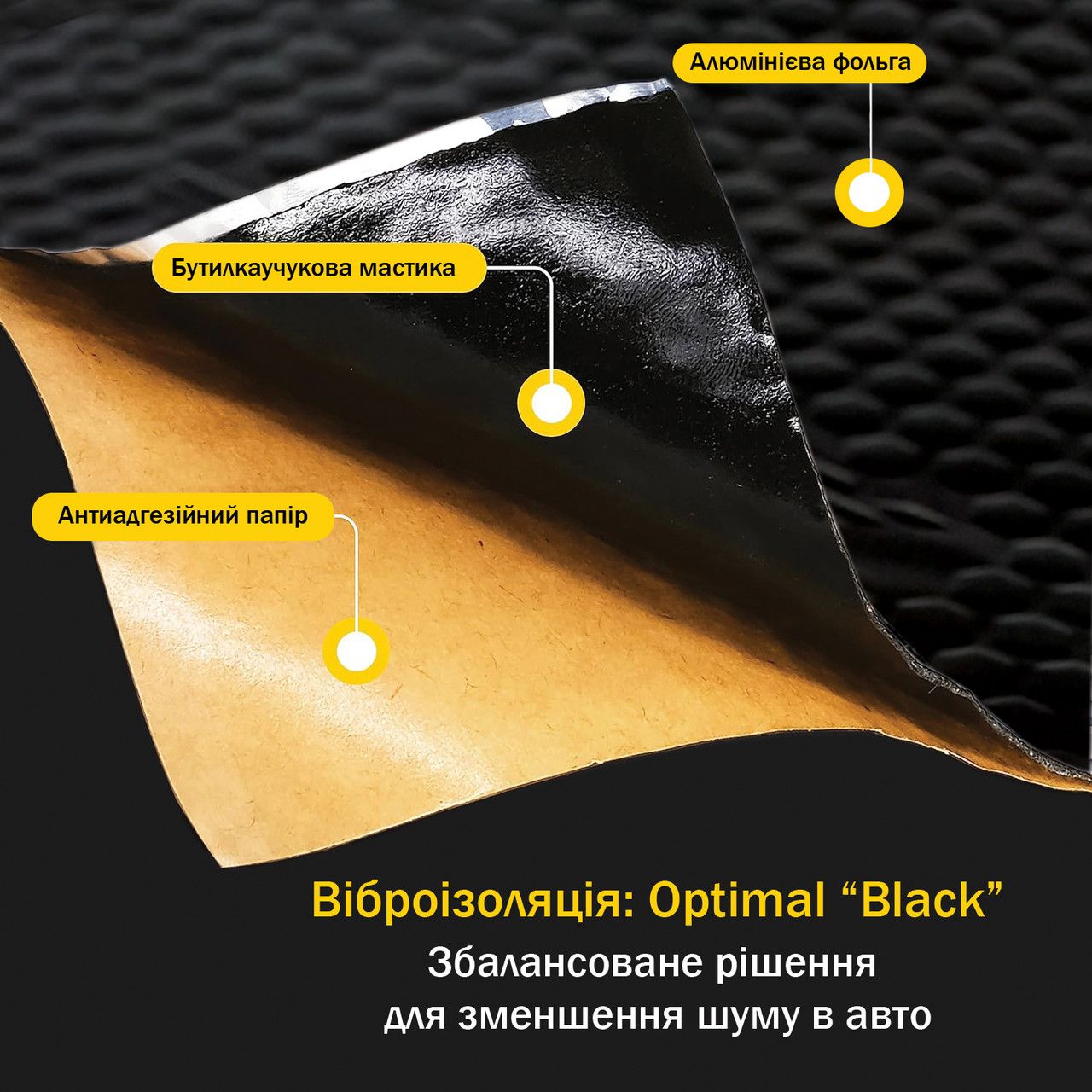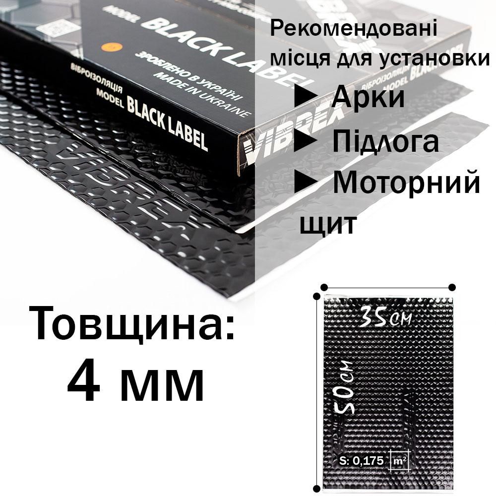 Black Label 4 мм Виброизоляция бизнес класса от тм Vibrex. Благодаря уникальной формуле бутилкаучуковой мастики Extreme - S удалось достичь увеличенного на 20% коэффициента механических потерь (КМП), на 34% повысилась адгезия к металлу и пластику, увеличился диапазон рабочих температур. Материал, как и предшественник Vibrex Master, состоит из полимерного слоя без добавления битума, гудрона и продуктов вторичной переработки. То есть при монтаже нет необходимости в нагреве и виброизоляция не выделяет вредных веществ, а эффективность сопоставима с самыми дорогими материалами премиум класса. Применение данной виброизоляции в комплексе с шумоизоляцияонными материалами позволяет снизить уровень шума и вибраций в авто более чем в 2,5 раза. Гарантия на виброизоляцию 15 лет! Vibrex Black Label - эффективный вибропоглотитель с улучшенными характеристиками и абсолютно новыми свойствами. - толщина 4,0 мм; - размер листа 500*350 мм; - толщина фольги 100 микрон; - КМП 0,55; - дополнительные антикоррозионные свойства; - вес