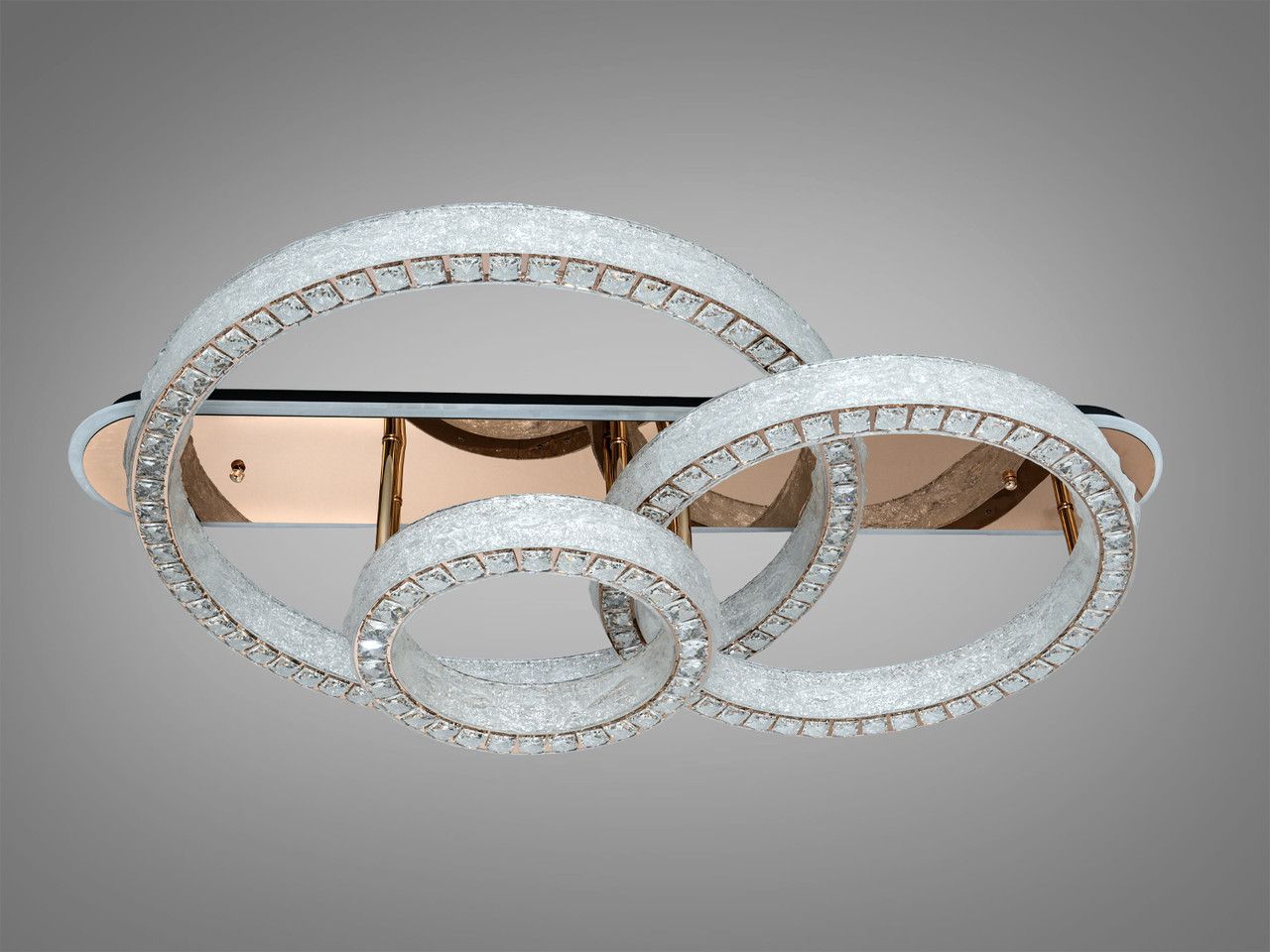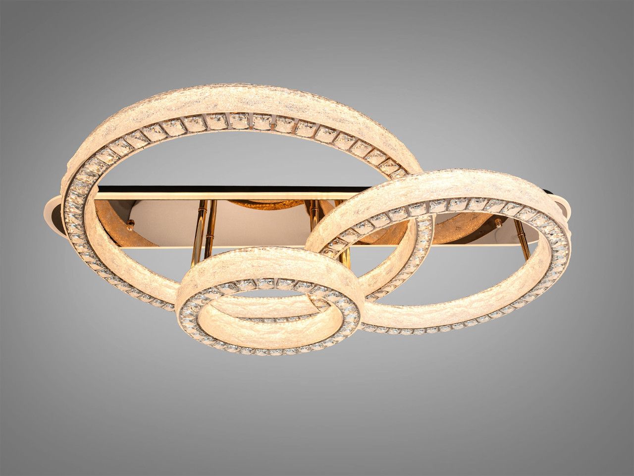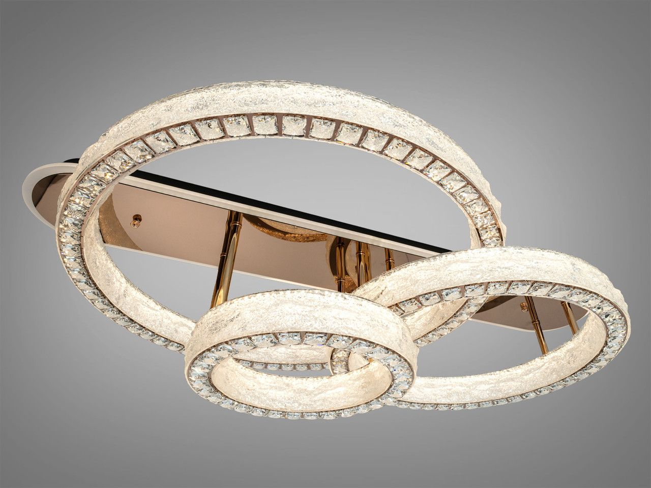 Конструкция состоит из длинного металлического основания (120 см) черного цвета, на котором закреплены три световых кольца разного диаметра. Кольца расположены внахлест, создавая объемную многоуровневую композицию. Внешние грани колец инкрустированы прозрачными кристаллами хрусталя, а внутренние — закрыты акриловым рассеивателем. Сочетание темного корпуса и золотистых элементов подвеса подчеркивает современный стиль исполнения. При высоте 30 см модель сохраняет визуальную легкость, несмотря на значительные габариты.