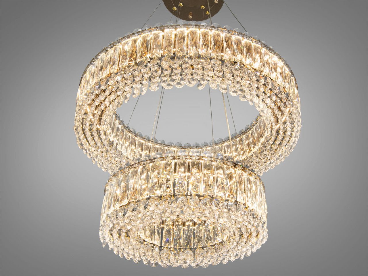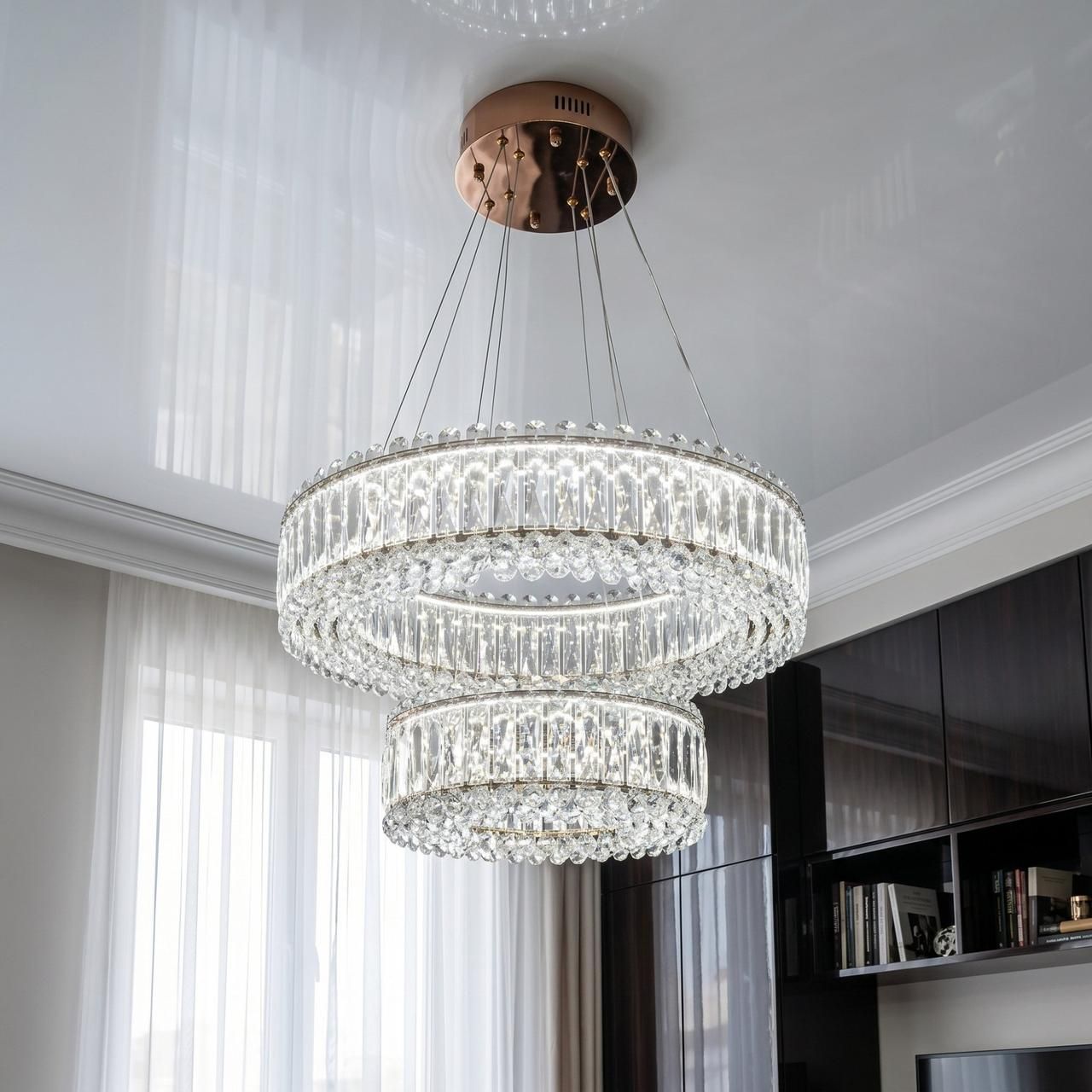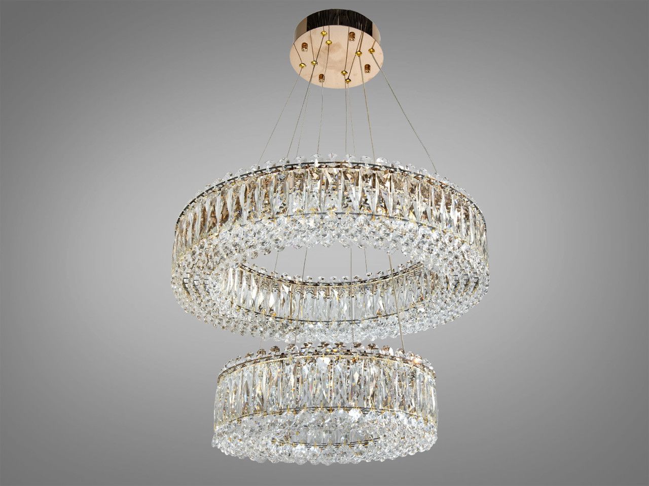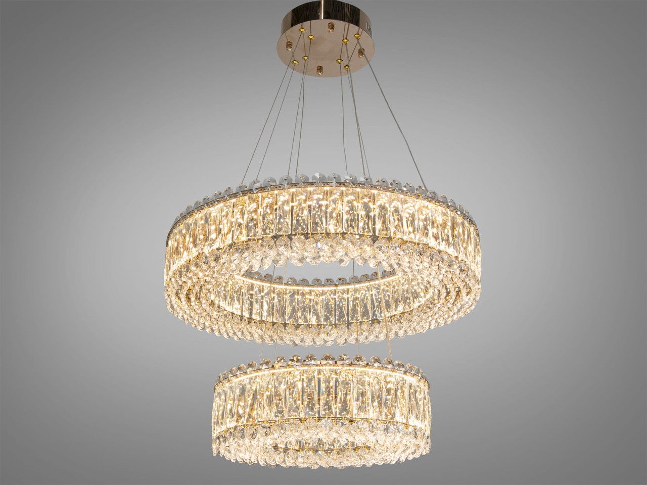 Модель представляет собой подвесную каскадную конструкцию, состоящую из двух горизонтальных световых колец разного диаметра. Металлический каркас выполнен в цвете «глянцевое золото» с зеркальным эффектом. Внешние грани колец инкрустированы прозрачными кристаллами хрусталя, которые преломляют свет, создавая характерные отблески на потолке. Система подвеса на тонких тросах позволяет регулировать высоту люстры от 80 до 160 см. В выключенном состоянии кристаллы сохраняют прозрачность, а золотое напыление — чистый блеск.