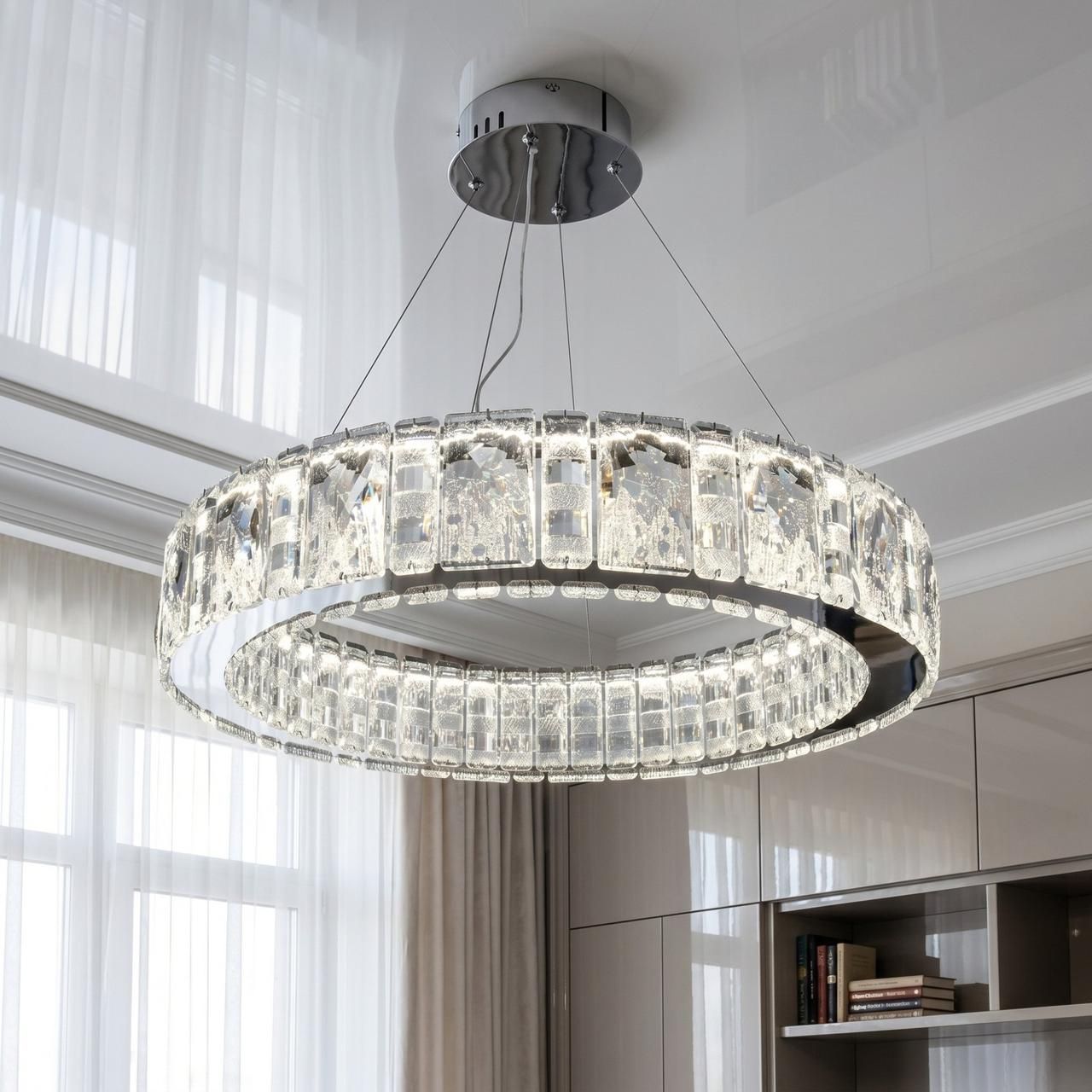 Модель для современных интерьеров площадью до 16 м², генерирующая световой поток 3740 лм через массив ограненного хрусталя. Регулируемая высота от 40 до 105 см и три режима цветовой температуры делают люстру функциональным решением для жилых и коммерческих зон.