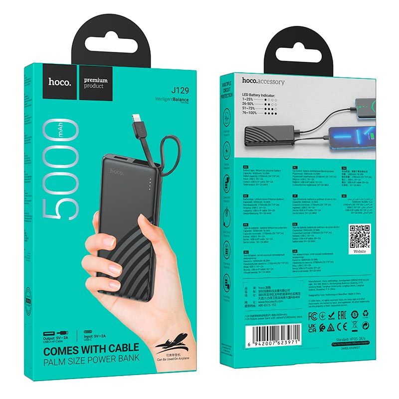 Повербанк HOCO J129 (Lightning) Nature power bank with cable 5000mAh |1Type-C/1USB, 2A| black