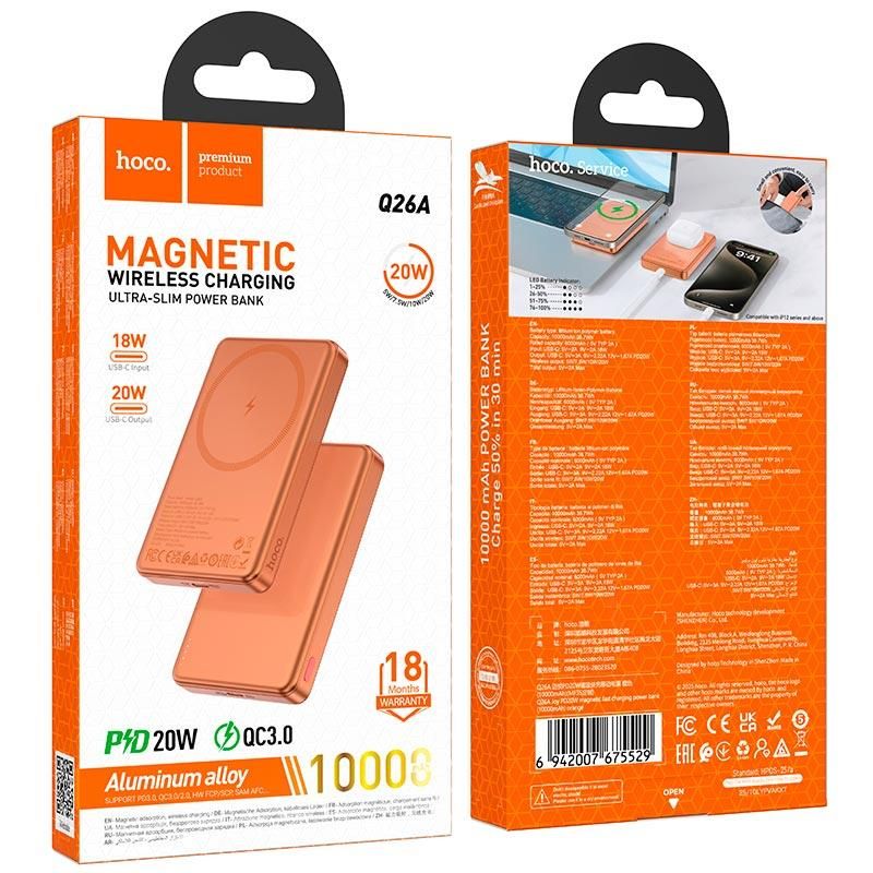Повербанк HOCO Q26A Joy PD magnetic fast charging power bank 10000mAh |1Type-C, 20W/3A, PD/QC| orange
