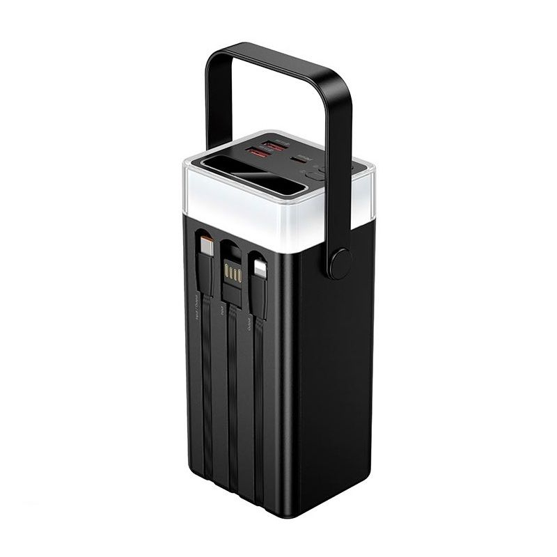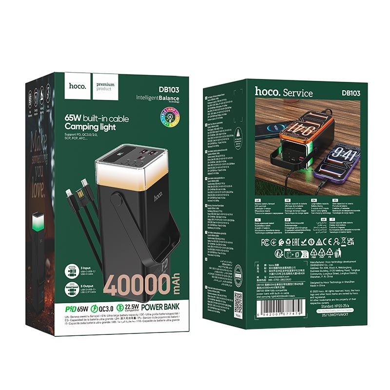 Повербанк HOCO DB103 65W fully compatible power bank with built-in cable and camping light 40000mAh |2USB/1Type-C, PD/QC, 65W/3A| black