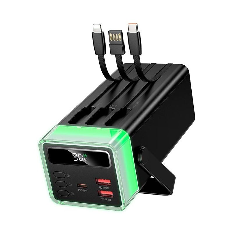 HOCO DB103 — это многофункциональный внешний аккумулятор, предназначенный для интенсивного использования в дороге, на работе, в путешествиях и при отсутствии доступа к электросети. Модель сочетает в себе мощный источник питания, встроенные кабели и яркий кемпинговый фонарь, обеспечивая максимальную автономность и удобство.