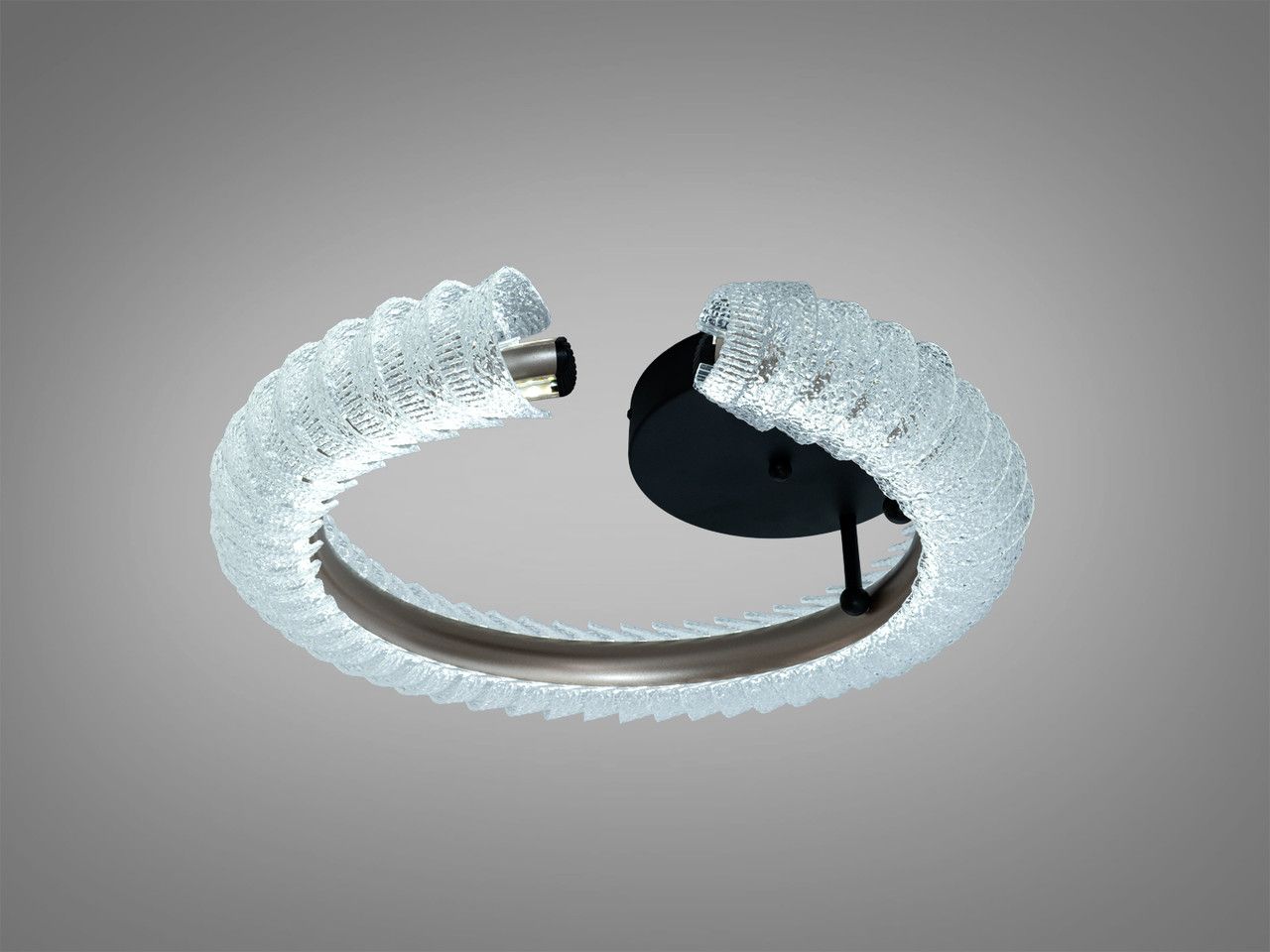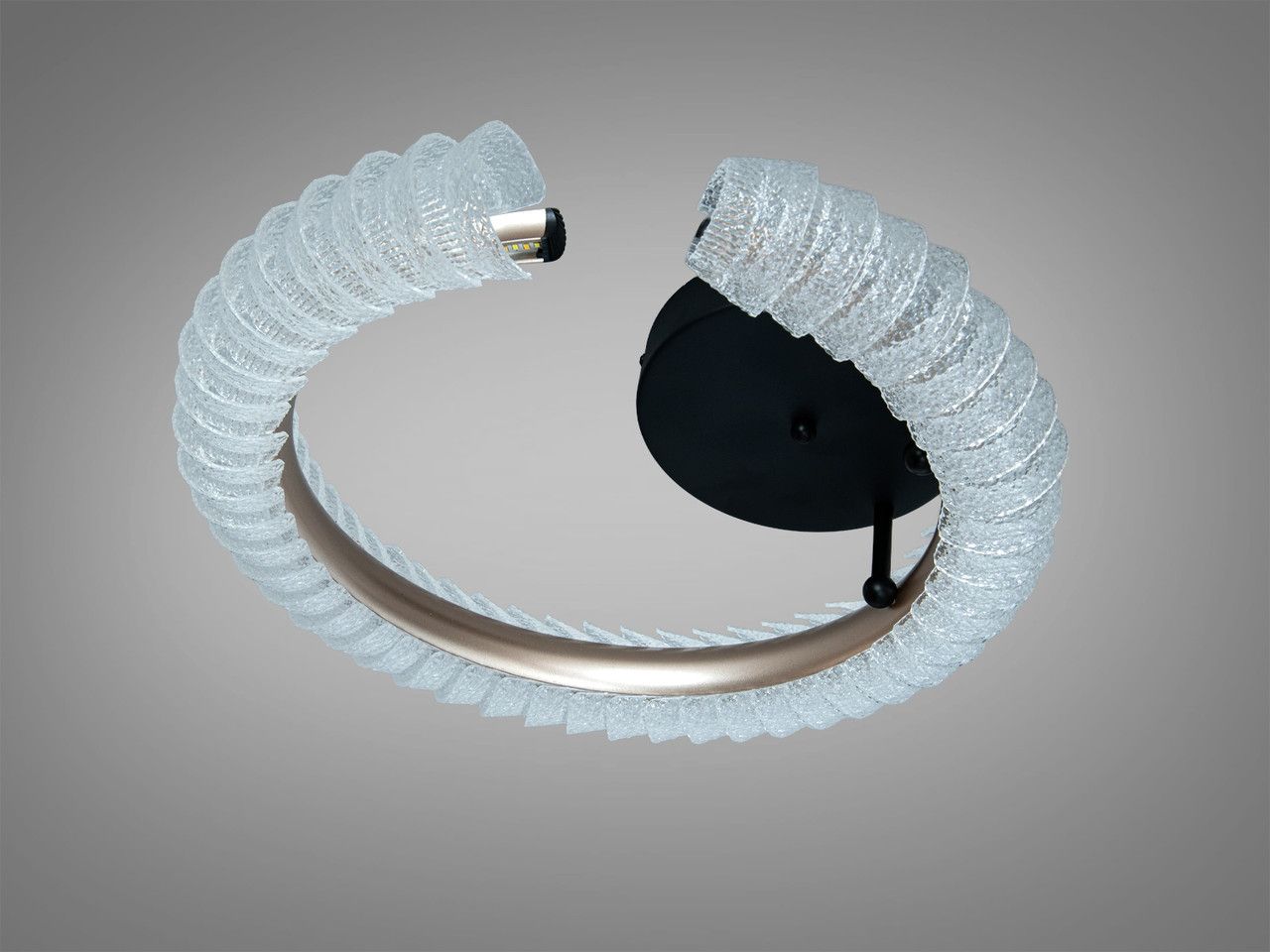 Модель выполнена в современном стиле с разомкнутым световым контуром, закрепленным на круглом основании. Металлический каркас имеет элегантное покрытие цвета «шампань», нанесенное методом качественной окраски. Высота корпуса составляет всего 15 см, что позволяет устанавливать люстру в комнатах со стандартной или малой высотой потолков без визуального уменьшения пространства. Световой элемент закрыт текстурированным акриловым рассеивателем, который имитирует ледяную крошку и мягко распределяет лучи.