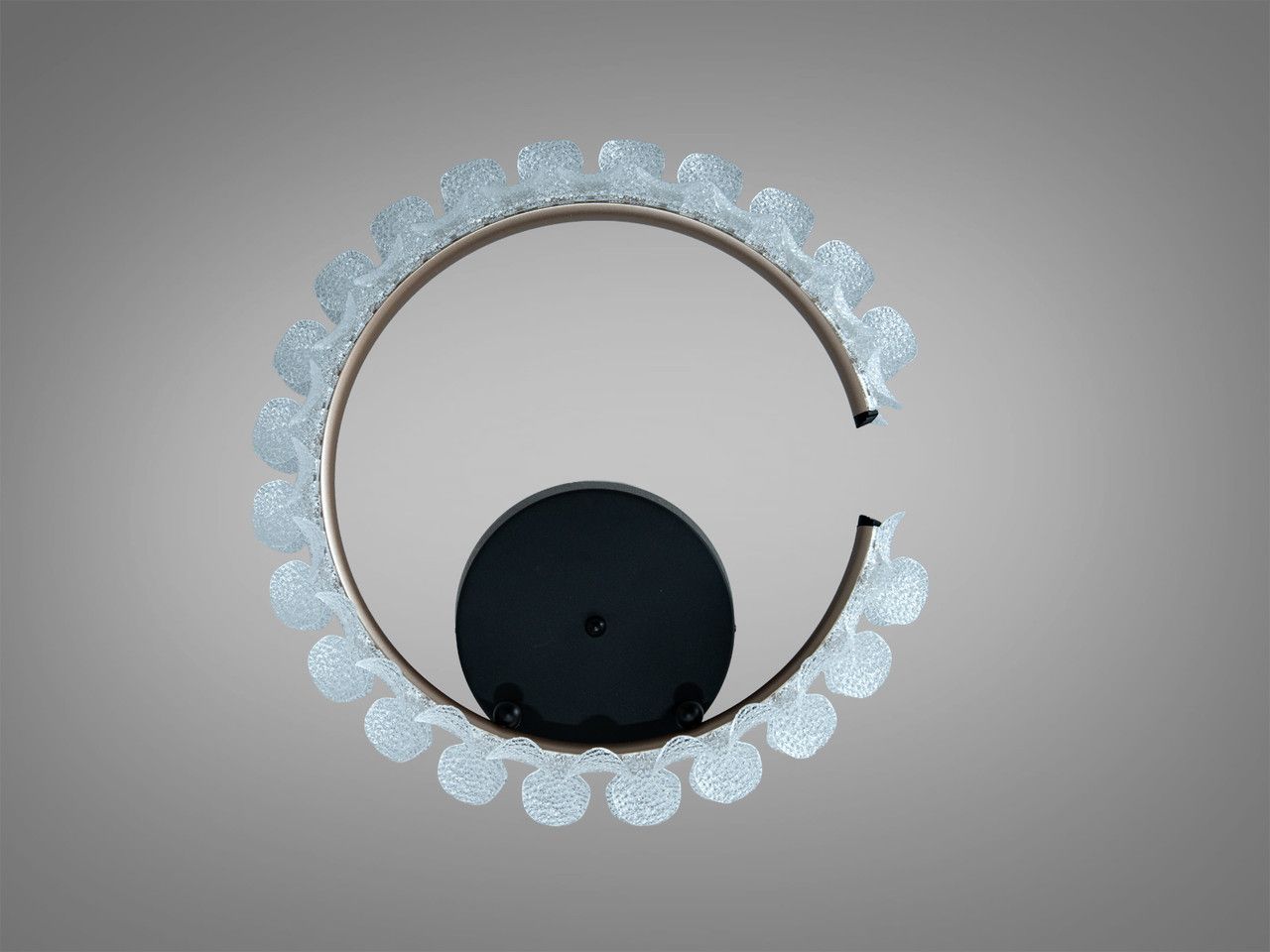 Модель выполнена в форме изящного кольца, декорированного множеством прозрачных акриловых элементов, напоминающих лепестки. Каркас изготовлен из металла с качественным покрытием цвета «шампань». Светильник имеет припотолочный тип крепления с вылетом всего 16 см, что делает его подходящим для комнат с невысокими потолками. Круглое основание диаметром 20 см обеспечивает надежную фиксацию на монтажной планке.