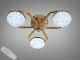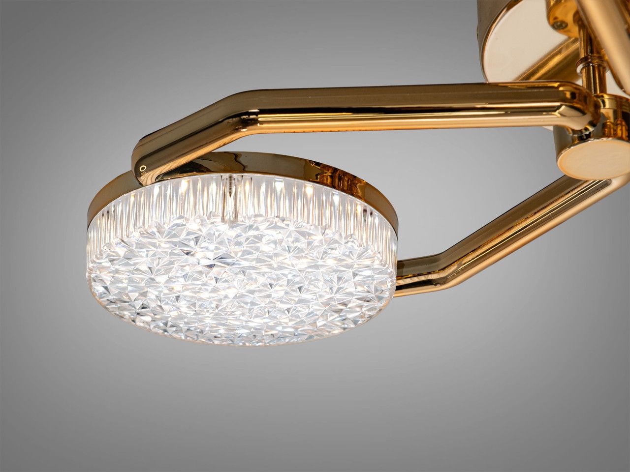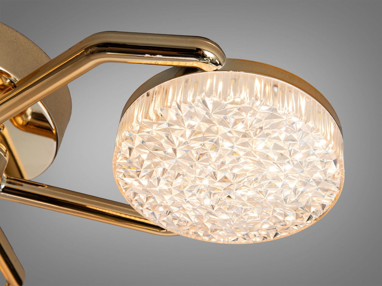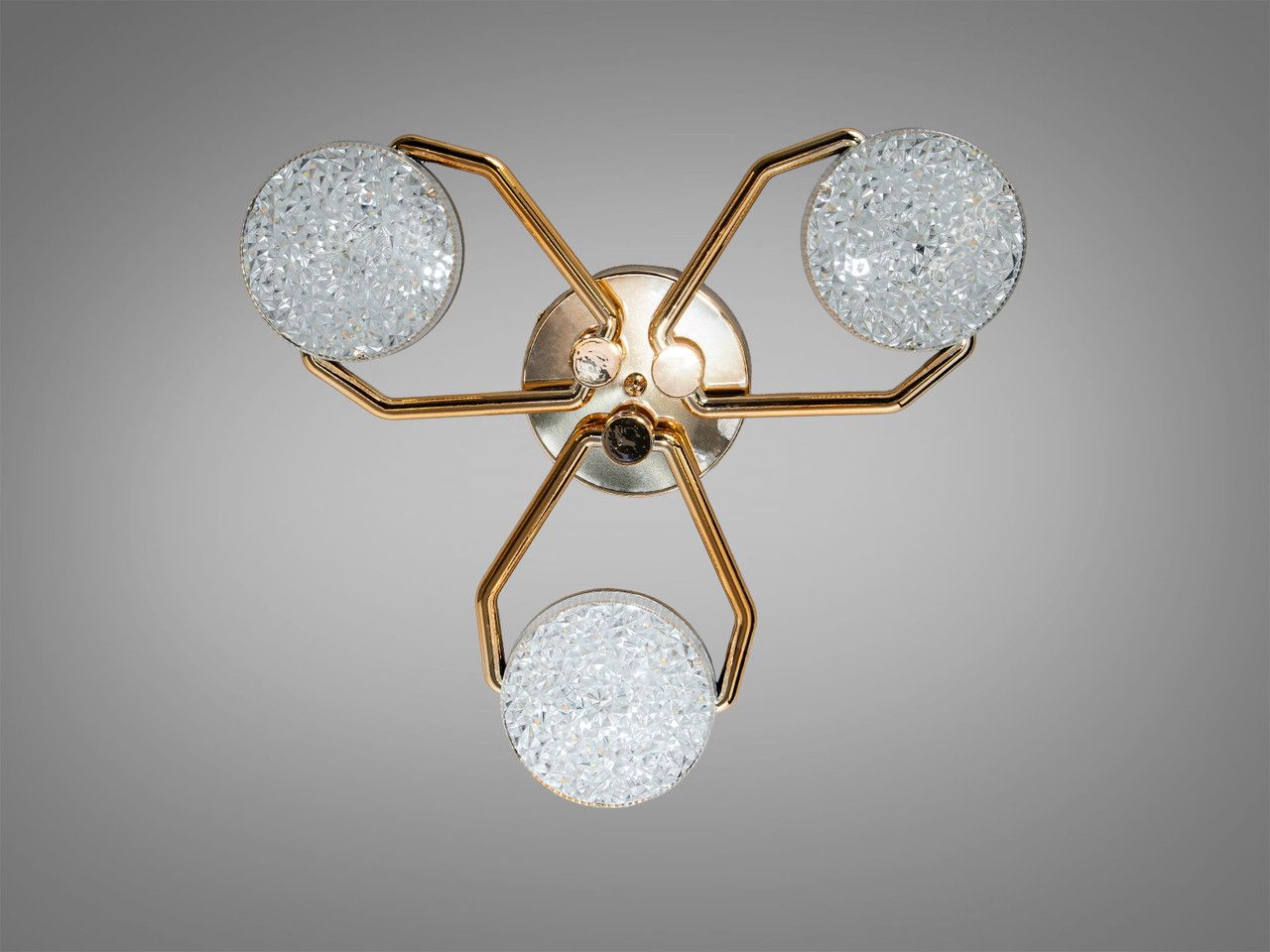 Конструкция люстры состоит из центрального основания и трех симметрично расходящихся металлических рожков. Каждый рожок увенчан плоским круглым плафоном из акрила с мелкозернистой фактурой, имитирующей блеск инея или кристаллов. Металлический каркас обработан методом гальваники в цвете золото, что обеспечивает стойкость к коррозии и глянцевый блеск. Минимальная высота изделия (10 см) позволяет интегрировать его в верхнюю треть помещения без потери полезного объема пространства.