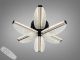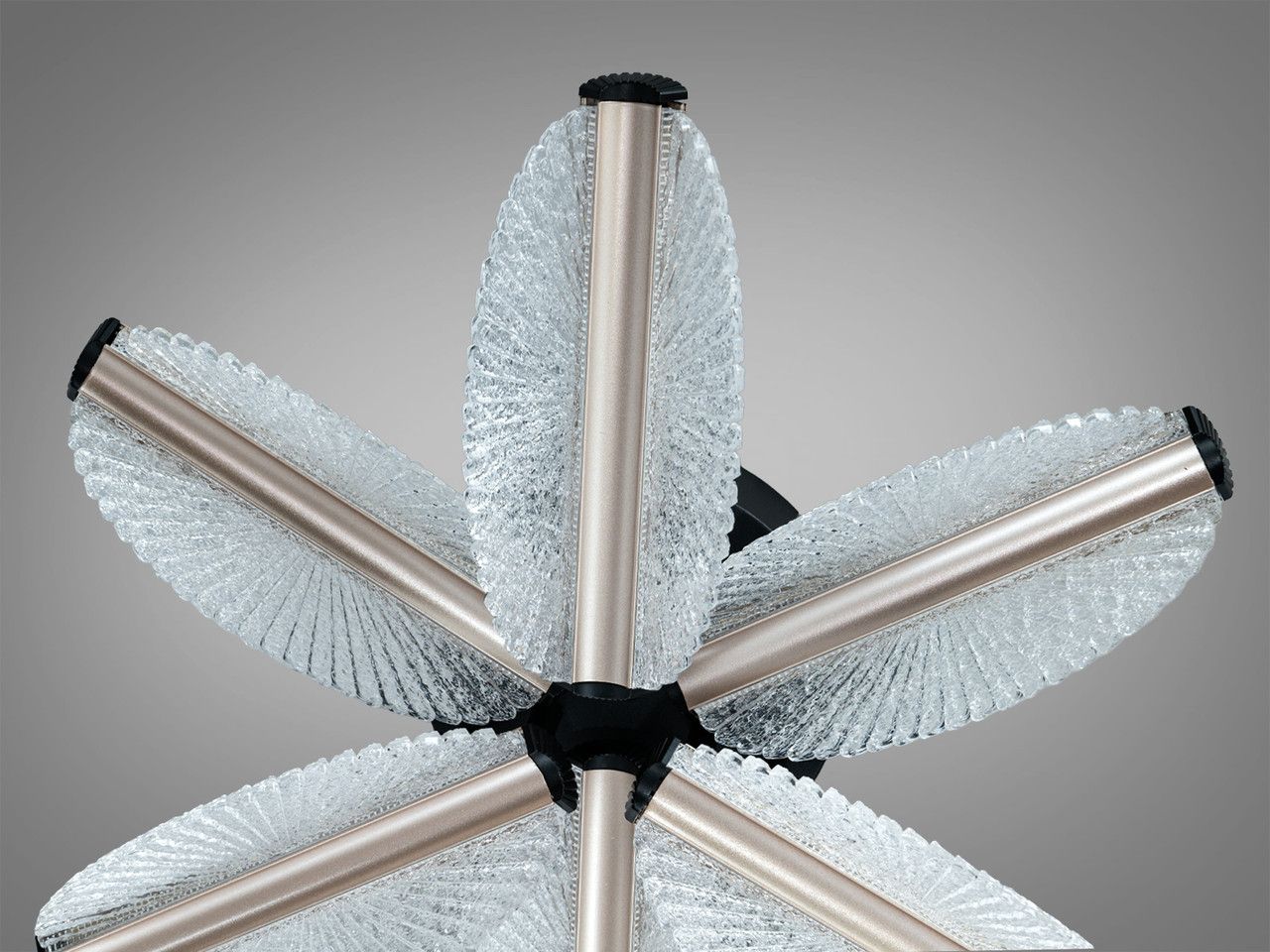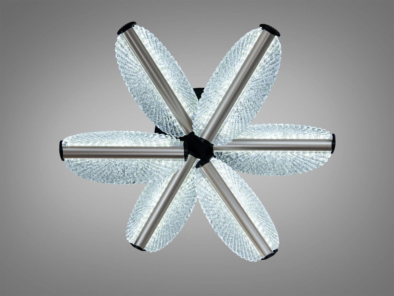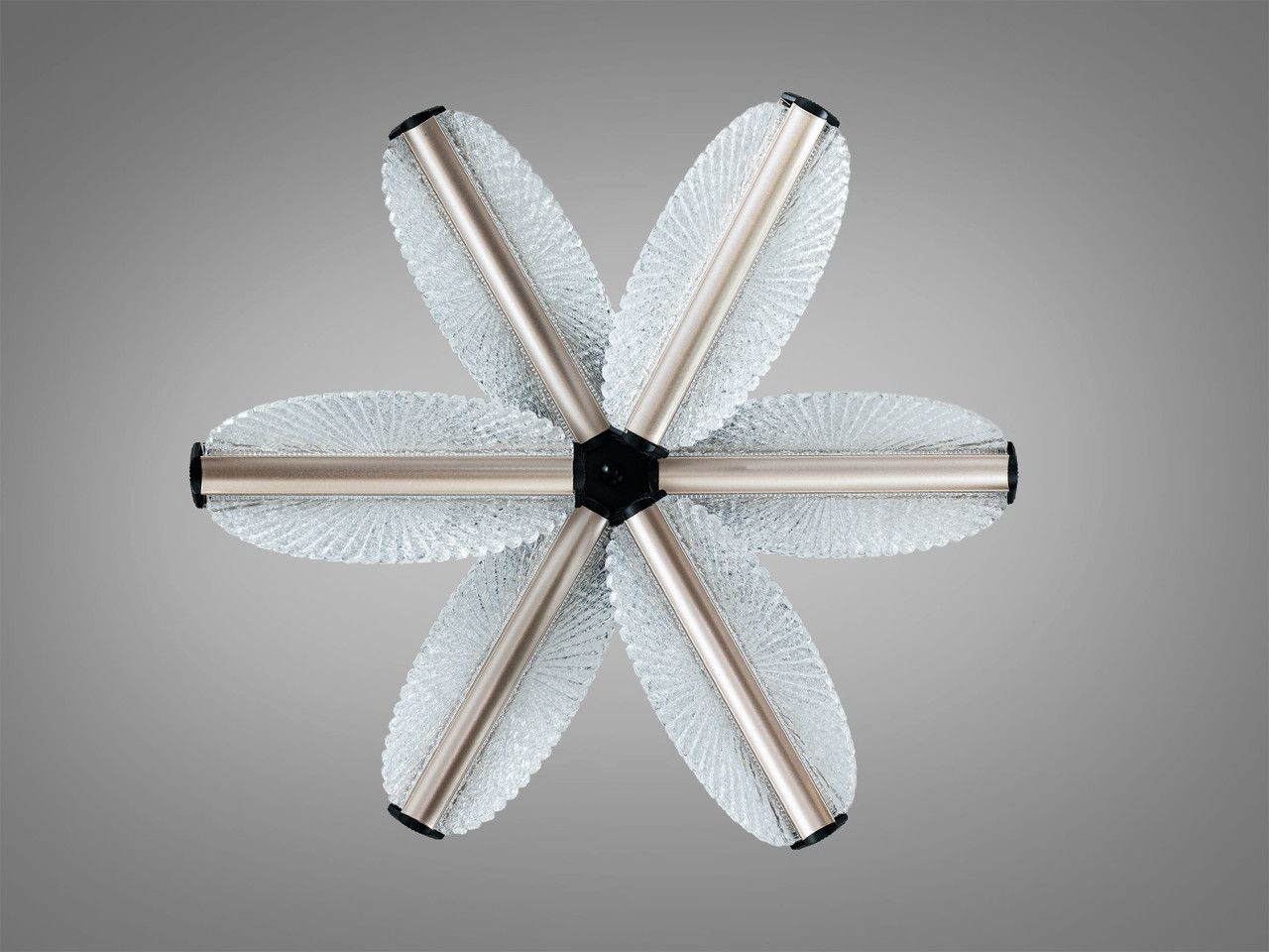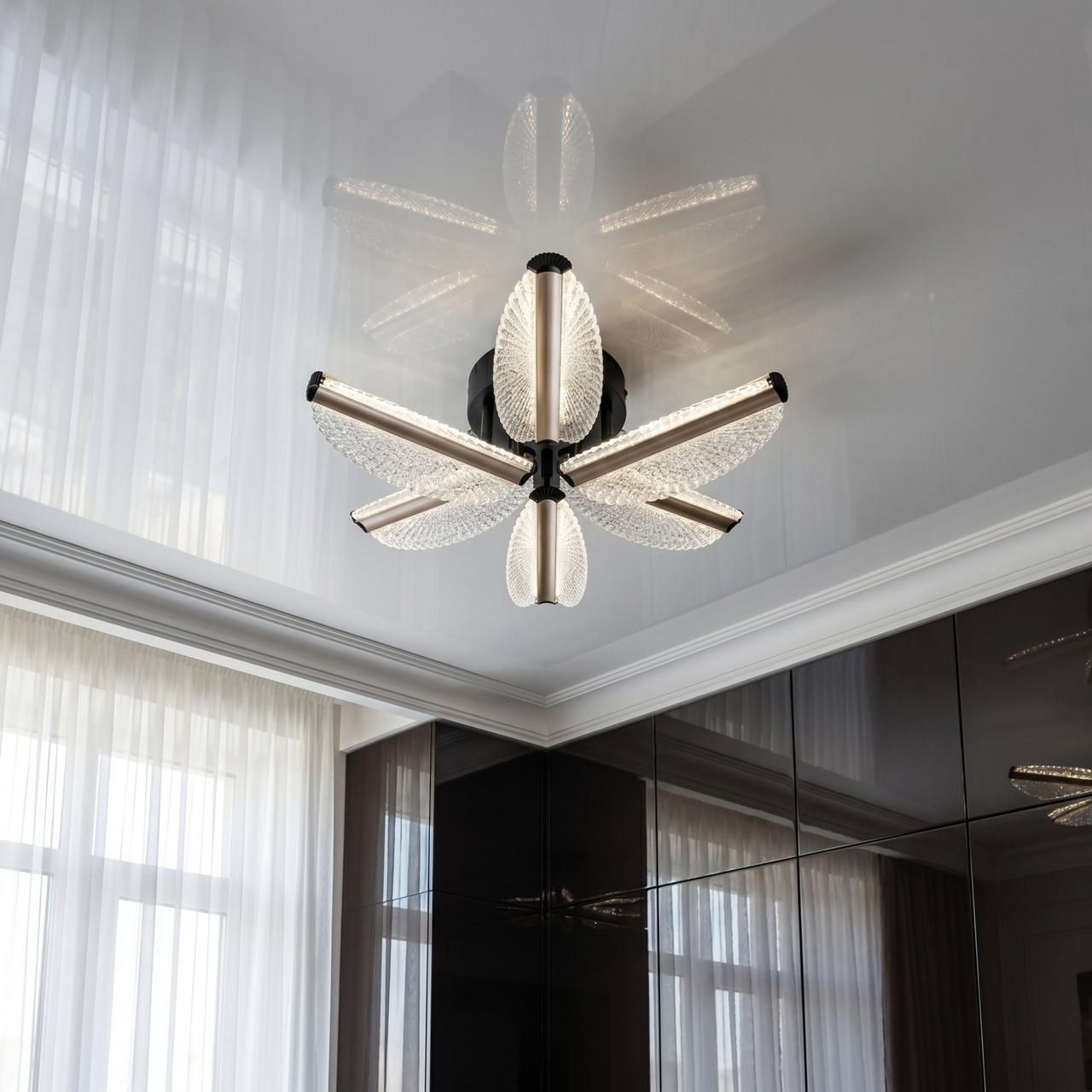 Конструкция выполнена в виде стилизованного пятилистника, где каждый лепесток закреплен на центральном металлическом основании диаметром 16 см. Каркас имеет комбинированную отделку: матовый черный цвет основы сочетается с гальваническим покрытием «золото шампань» на несущих элементах. Световые модули закрыты акриловыми рассеивателями с кристаллической текстурой, которая создает эффект мягкого преломления лучей. Геометрия изделия ориентирована на плотное прилегание к потолку, визуально расширяя пространство в верхней трети комнаты.