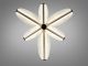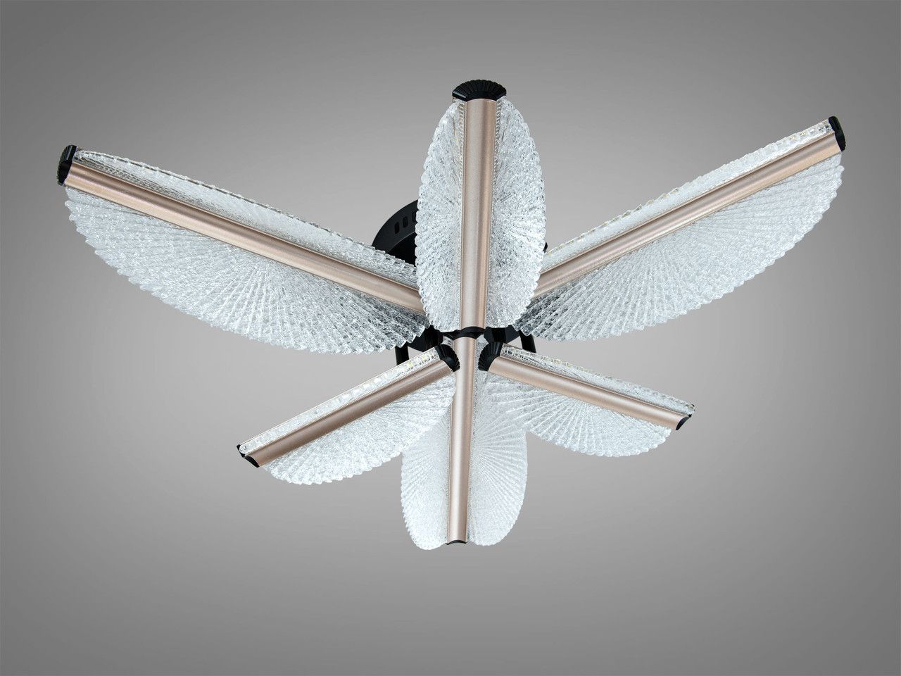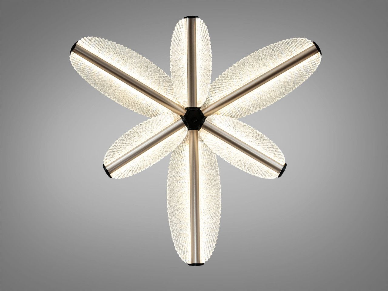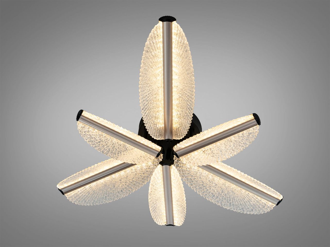 Модель выполнена в футуристическом стиле и состоит из пяти световых элементов в форме лепестков, расположенных вокруг центральной оси. Металлический каркас имеет комбинированное покрытие: глубокий черный цвет основания сочетается с акцентами в цвете «золото шампань», нанесенными методом гальваники. Плафоны изготовлены из высококачественного акрила с кристаллической фактурой, которая эффективно преломляет лучи светодиодной ленты, создавая мягкое, объемное свечение. Компактная высота 15 см обеспечивает визуальную легкость конструкции и позволяет монтировать ее в помещениях с невысокими потолками.