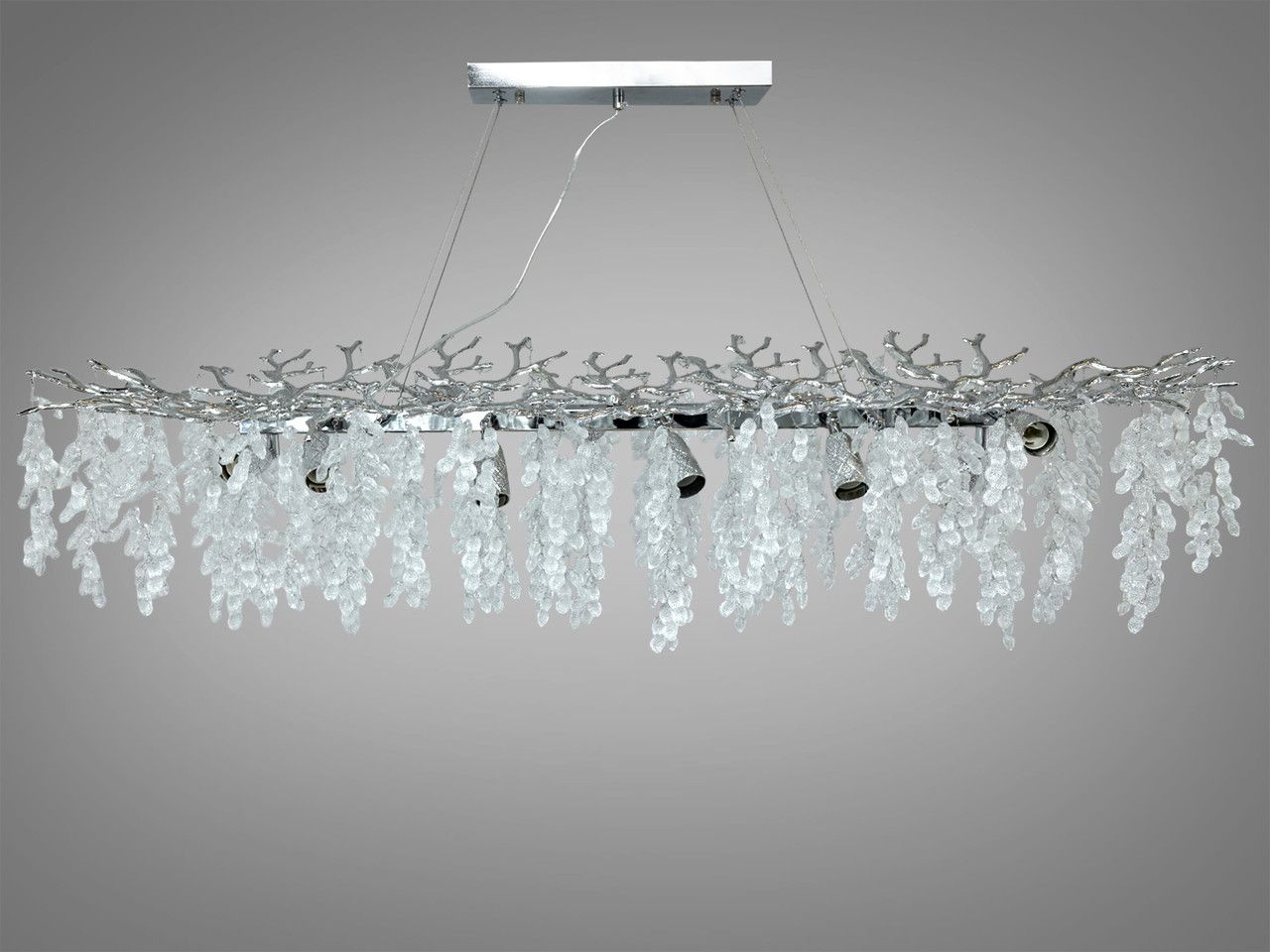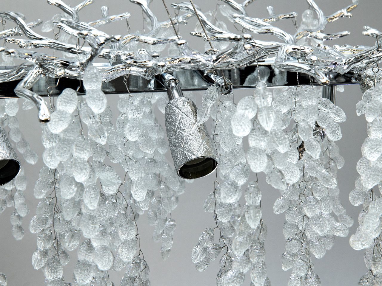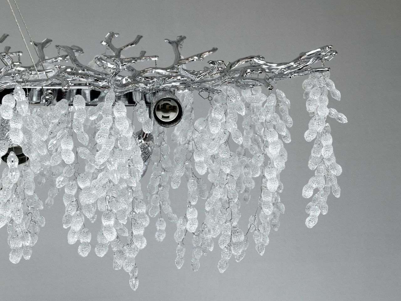 Конструкция люстры представляет собой вытянутый металлический каркас, стилизованный под ветви дерева. Металл обработан методом высококачественной гальваники в цвете хром. Декоративный объем формируется благодаря двенадцати световым точкам и густому каскаду подвесок из прозрачного кристалла (акрила), которые мягко ниспадают, скрывая патроны. Люстра фиксируется на прямоугольную монтажную планку (30х8 см) с помощью двух регулируемых подвесов. Высота настраивается в диапазоне от 45 до 95 см, что позволяет идеально расположить светильник над поверхностью стола или кухонного острова.