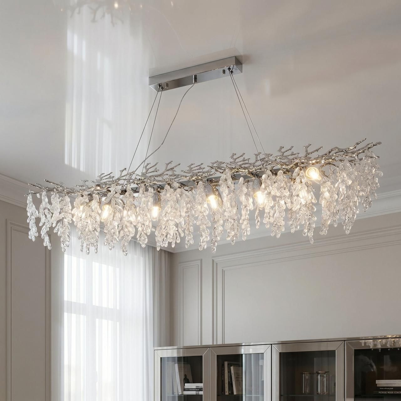Эта величественная линейная люстра длиной 122 см создана для парадного освещения обеденных зон и длинных столов в помещениях площадью до 30 м². Модель имитирует застывшие капли росы на ветвях, сочетая холодный зеркальный хром и каскад из множества кристальных лепестков.