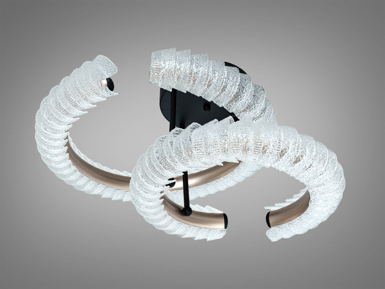 Конструкция люстры состоит из двух переплетенных S-образных металлических профилей, зафиксированных на круглом основании диаметром 20 см. Каркас окрашен в глубокий матовый черный цвет. По всей длине светового контура расположены декоративные акриловые рассеиватели в форме чешуек. Фактурная поверхность акрила эффективно преломляет свет, создавая объемное свечение. Общая высота изделия 30 см обеспечивает его визуальное доминирование в верхней трети помещения при сохранении компактности.