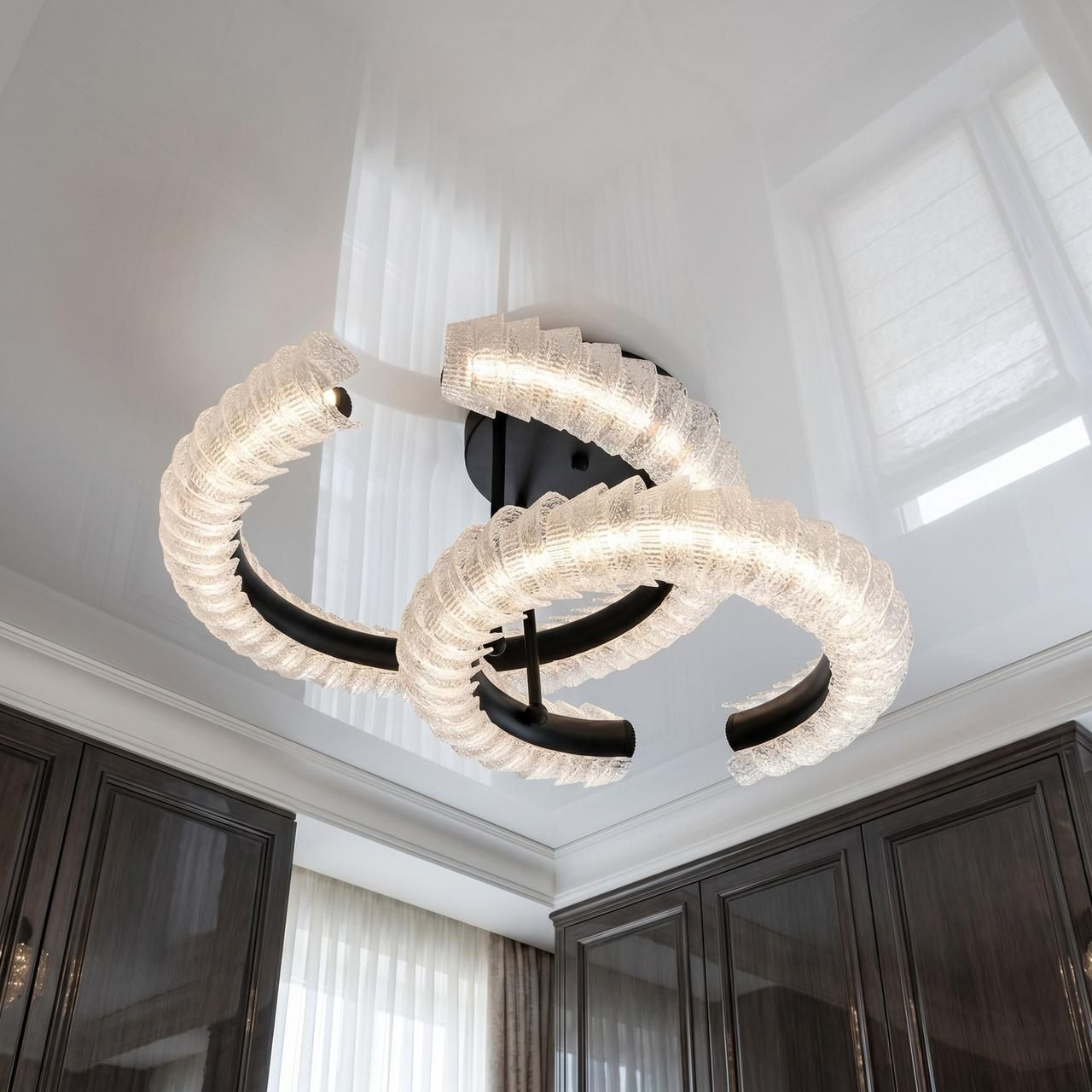Эта дизайнерская потолочная люстра мощностью 80 W разработана для освещения современных интерьеров площадью до 18 м². Благодаря S-образной геометрии и акриловым элементам с кристаллической текстурой, светильник обеспечивает равномерный поток 4400 lm без эффекта мерцания.