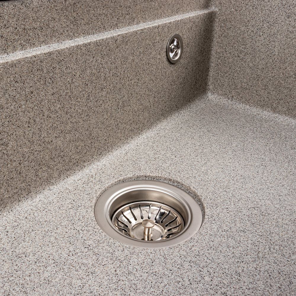 Мойка изготовлена из качественного гранитного композита, который отличается высокой устойчивостью к царапинам, ударам, перепадам температур и бытовой химии. Она не впитывает запахи и легко очищается, что делает её удобной в ежедневном использовании.