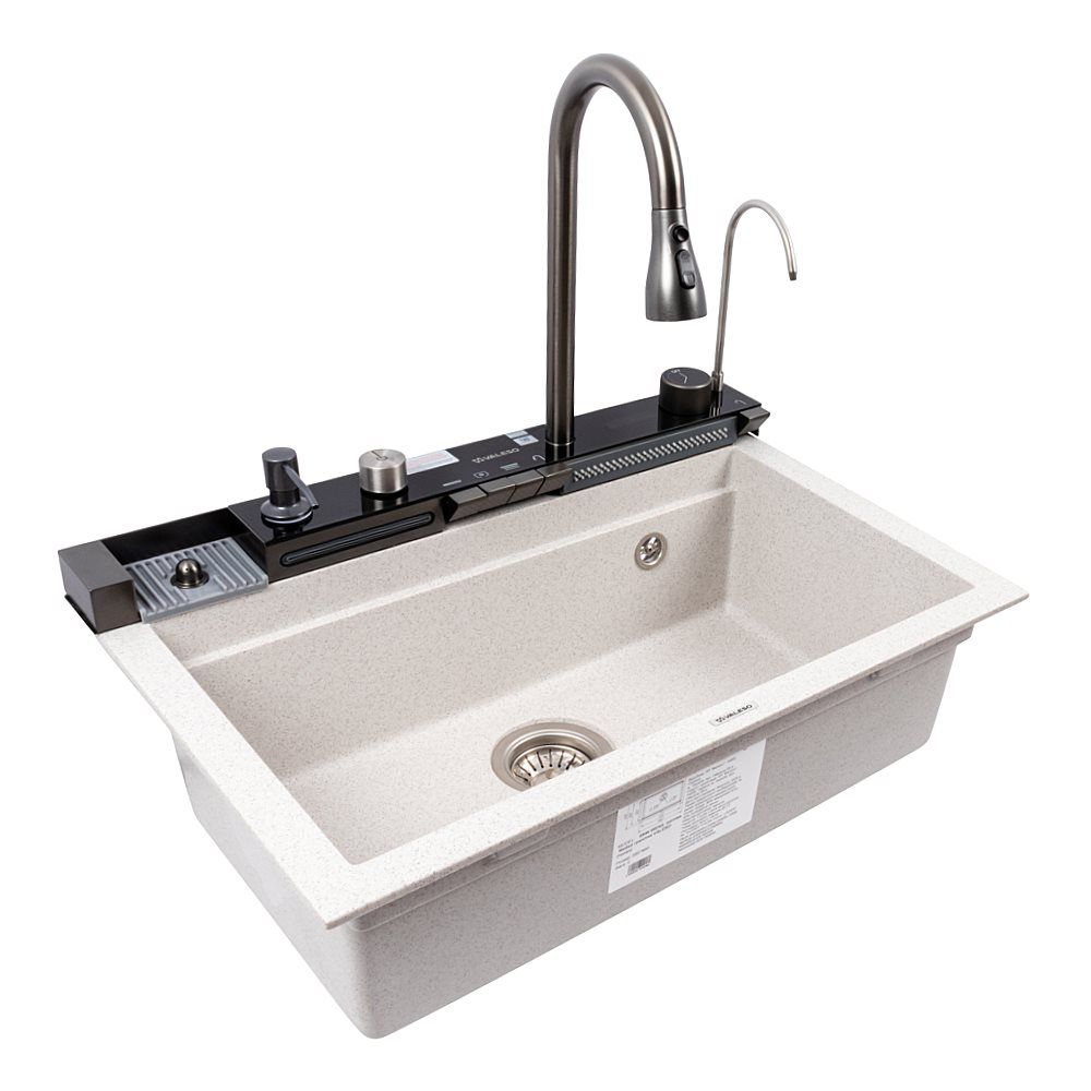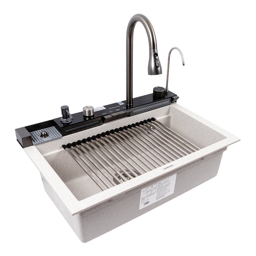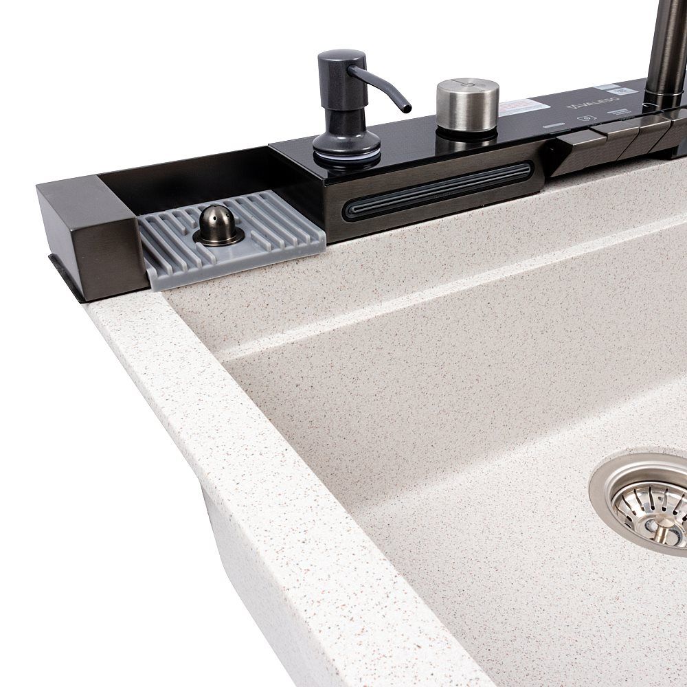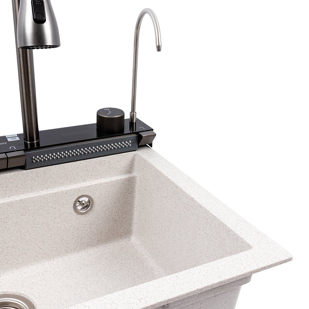 Мойка изготовлена из качественного гранитного композита, который отличается высокой устойчивостью к царапинам, ударам, перепадам температур и бытовой химии. Она не впитывает запахи и легко очищается, что делает её удобной в ежедневном использовании.