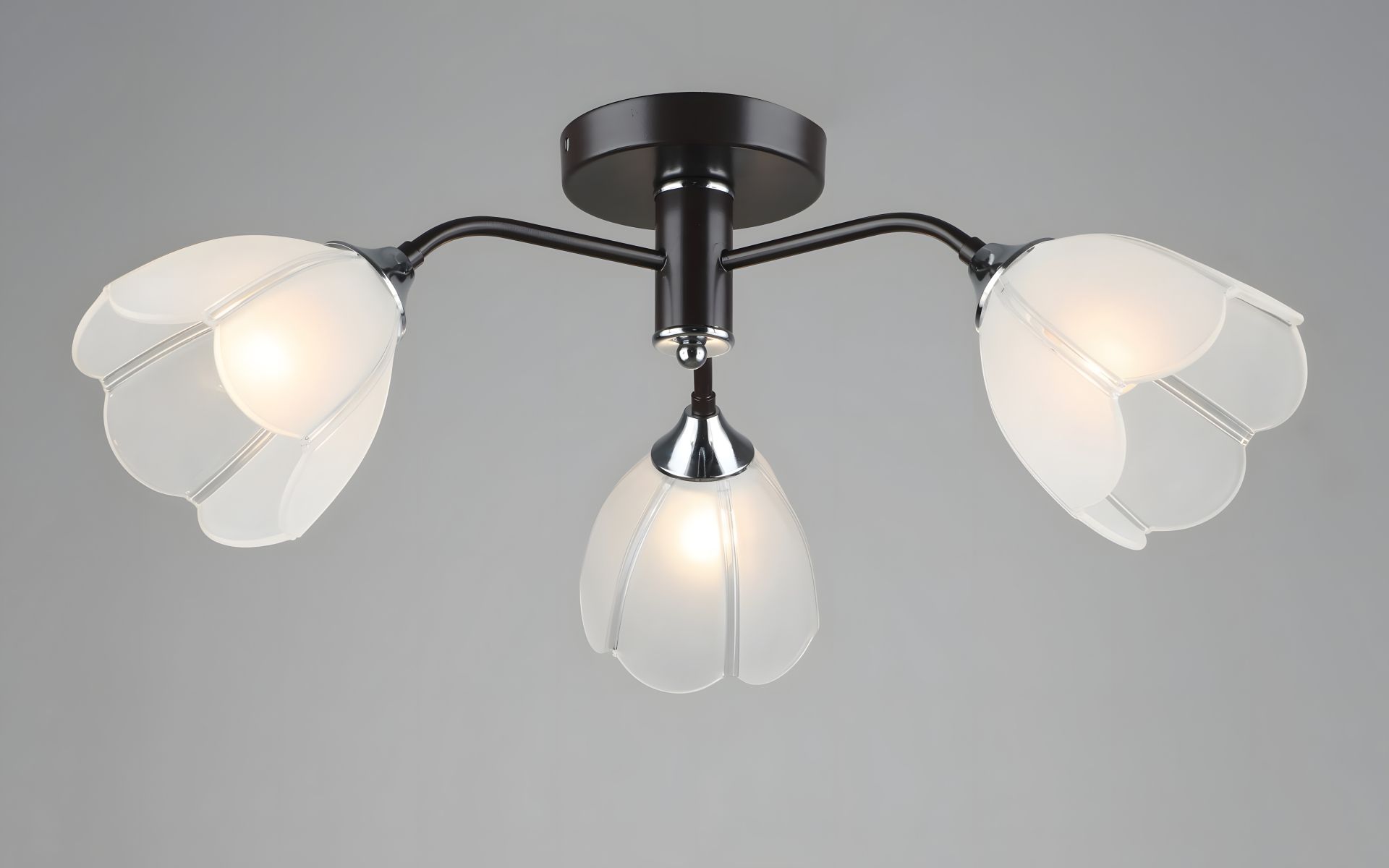 Эта люстра сочетает в себе элегантность цвета кофе и хромового создают свежий и современный вид. Каркас изготовлен из высококачественного металла, что обеспечивает прочность и долговечность. Три стеклянных плафона, выполненные в форме цветка, придают нежности и утонченности, делая люстру настоящим украшением вашего интерьера.