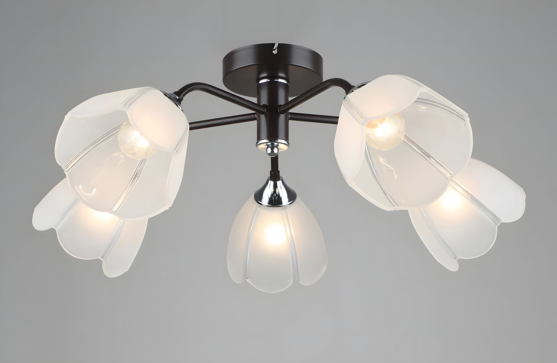 Эта люстра сочетает в себе элегантность цвета кофе и хромового создают свежий и современный вид. Каркас изготовлен из высококачественного металла, что обеспечивает прочность и долговечность. Пять стеклянных плафонов, выполненные в форме цветка, придают нежность и изящество, делая люстру настоящим украшением вашего интерьера.