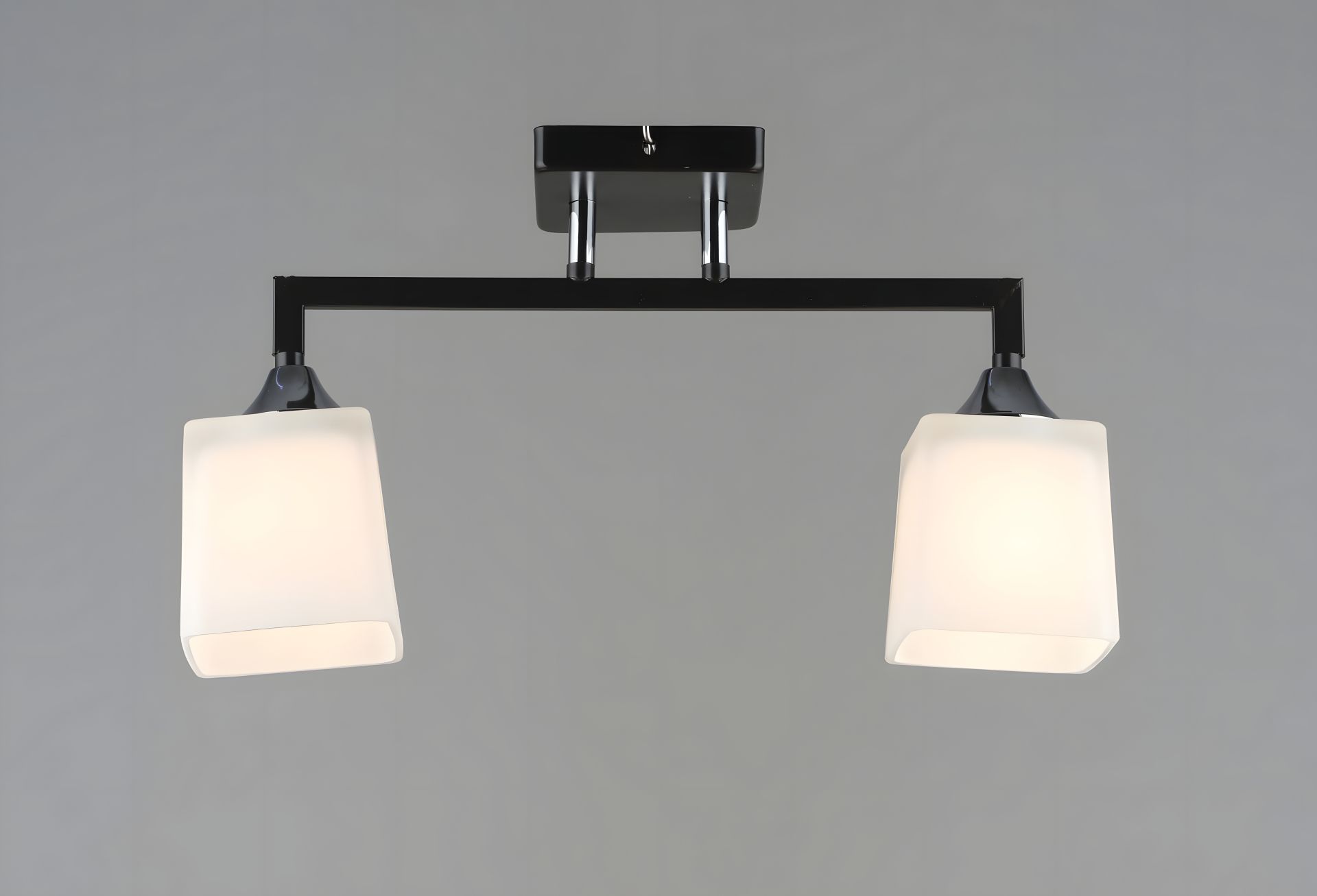 Люстра оснащена двумя стеклянными плафонами, равномерно рассеивающими свет, создавая мягкую и уютную атмосферу.
