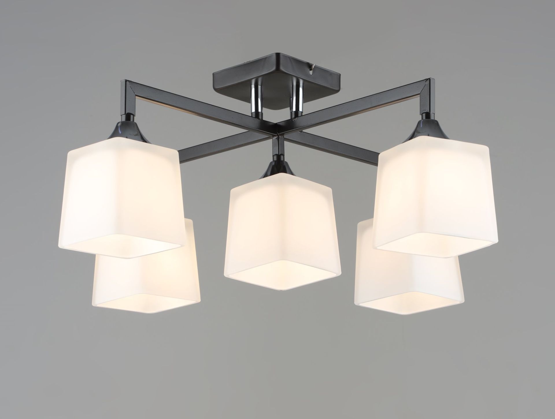 Люстра оснащена 5 стеклянными плафонами, равномерно рассеивающими свет, создавая мягкую и уютную атмосферу.