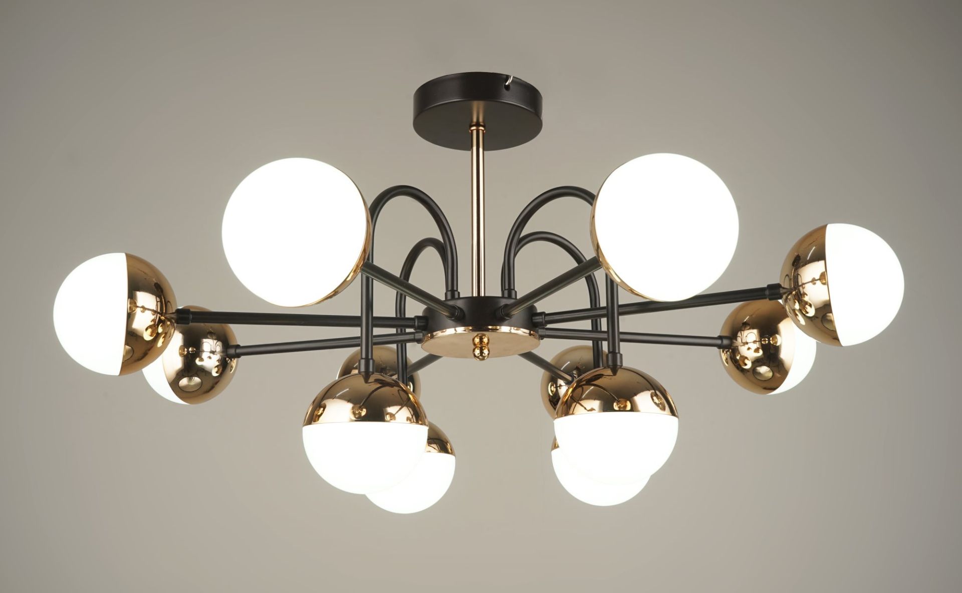 Каркас люстры выполнен из металла черного и позолоченного цвета, что придает ей современный вид с элементами роскоши. 12 круглых акриловых плафонов обеспечивают яркий и мягкий свет, равномерно распределяемый по всему помещению.