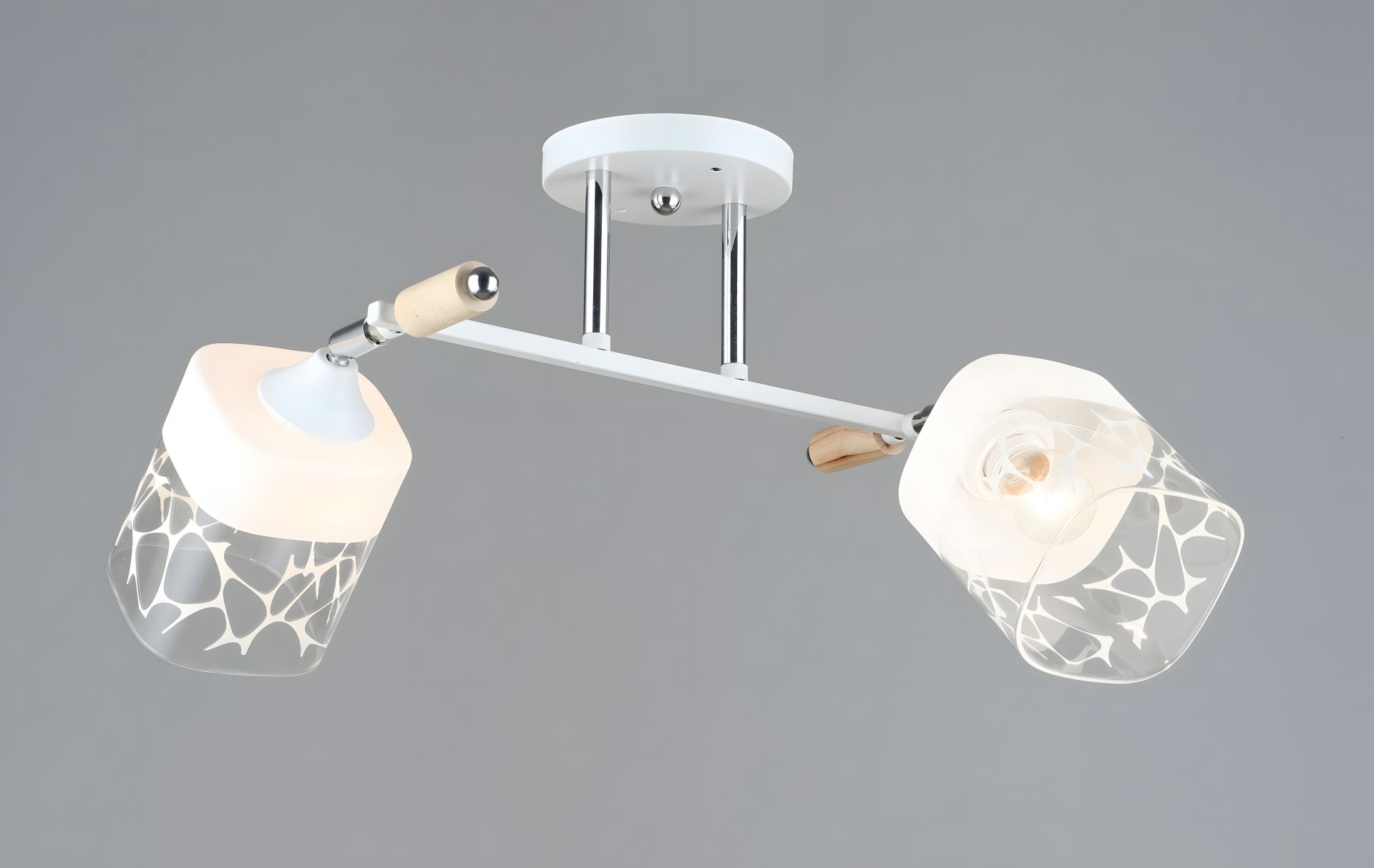 Каркас изготовлен из высококачественного металла белого и хромового цвета, что придает современному виду изделия. Два стеклянных плафона подчеркивают изысканность люстры, обеспечивая приятный, равномерный свет.