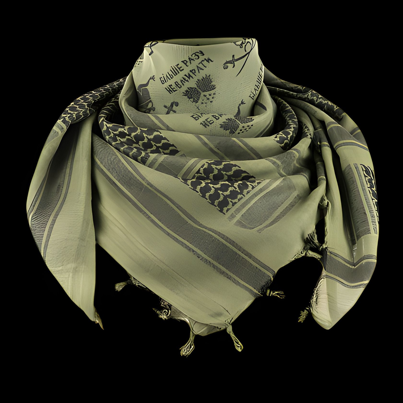 Арафатка (шемаг) «Сечь» на тему Запорожской Сечи с изображением казака, скрещенными саблями и девизом «Никогда больше не умирай».