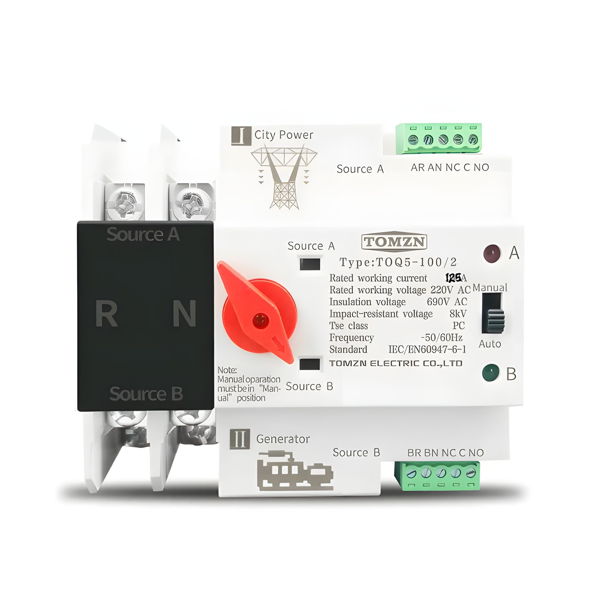 На din-рейке. Tomzn фирма, модель TOQ5-125/2p. Однофазный (переключатель с фазы на фазу).