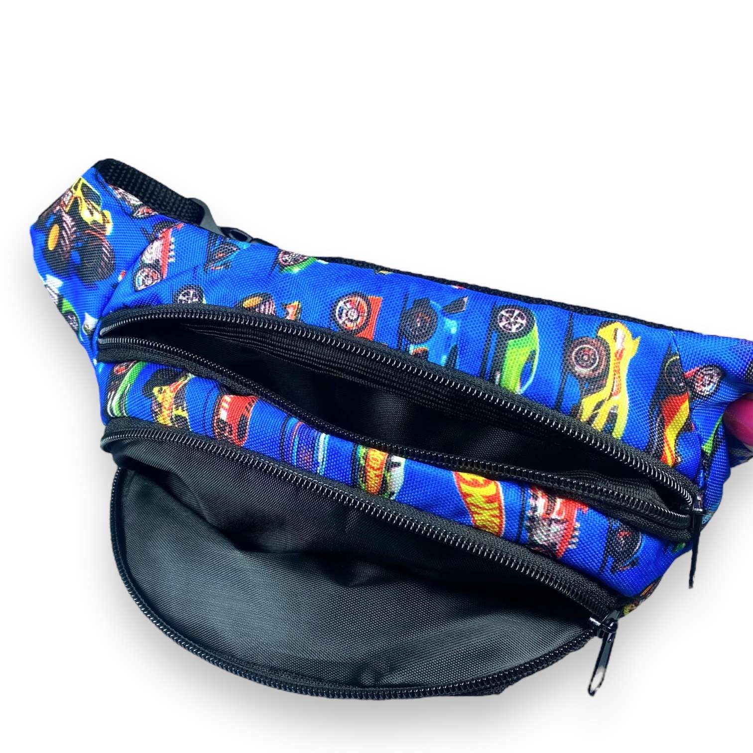 Бананка детская, два кармана, застежка фастекс на поясе, размер: 30*14*6 см, синяя Машинки