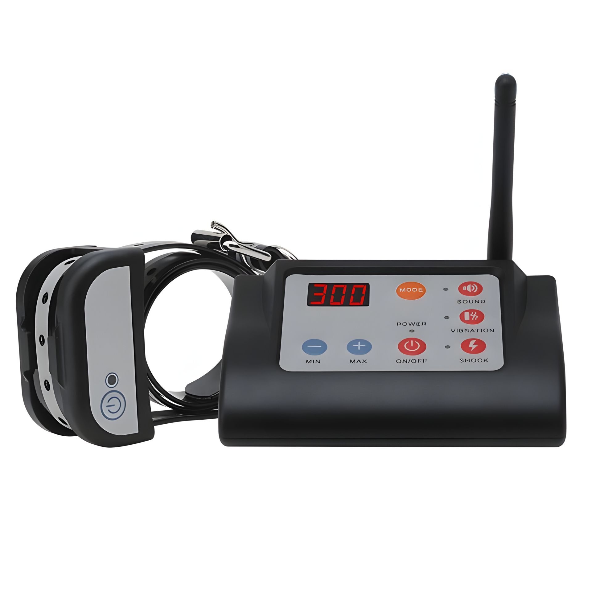 Беспроводной электронный забор для собак состоит из пульта управления с антенной и кнопками управления, а также 1, 2 или 3-х ошейников в водонепроницаемом корпусе, которые одеваются на собаку. В режиме электронного забора - при приближении к установленной вами границе, ошейник подаст предупреждающий звуковой сигнал, а затем при продолжении попытки выйти из неё окажет воздействие электрошоком. Можно настроить дальность действия электронного забора от 15 до 300 метров (дальность условная и зависит от наличия препятствий между пультом и ошейником).