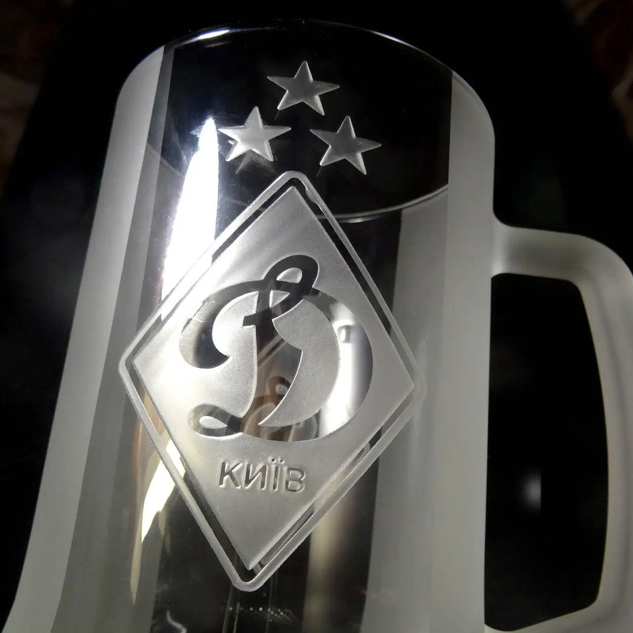 Стеклянная кружка для пива с ручной механической гравировкой логотипа футбольного клуба Динамо Киев матовая в подарочной коробке
