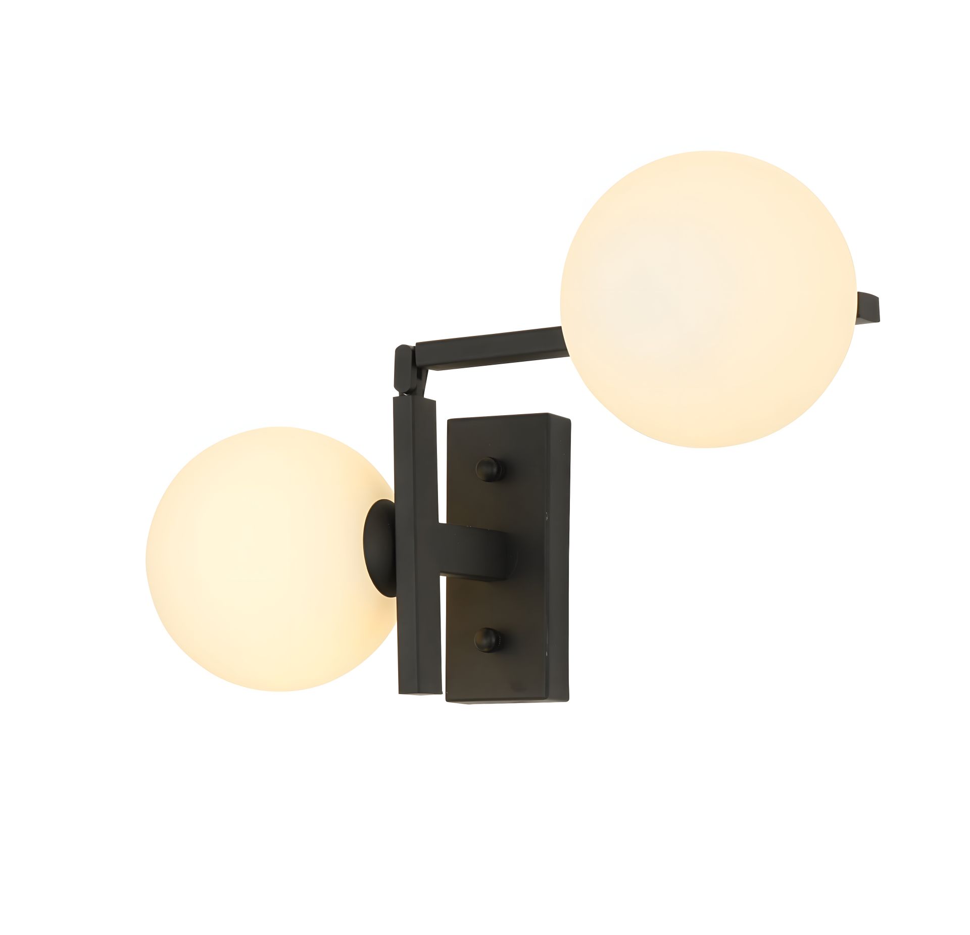 Элегантный черный металлический каркас и два круглых стеклянных плафона придают бра современный вид, который прекрасно впишется в любой интерьер – от минималистичного до модерна.